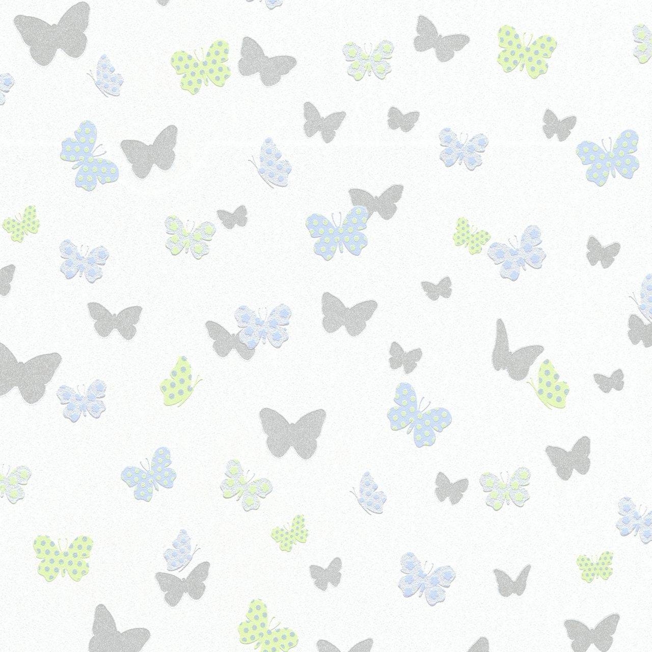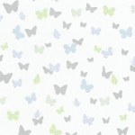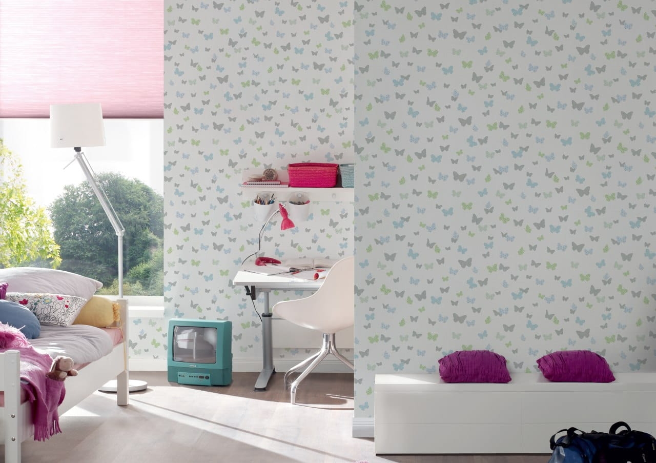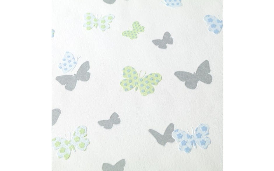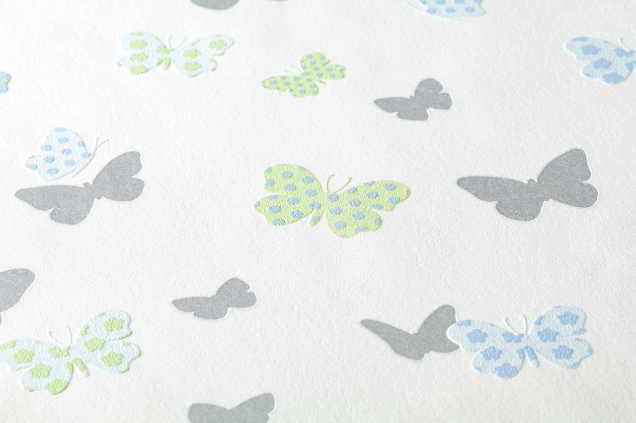 Tło tapety jest matowe, w odcieniu bieli, na nim niewielkie motylki. Jedne lekko wypukłe w różnych odcieniach niebieskiego i zieleni, drugie wklęsłe, delikatnie połyskujące w odcieniu szarości/srebra.