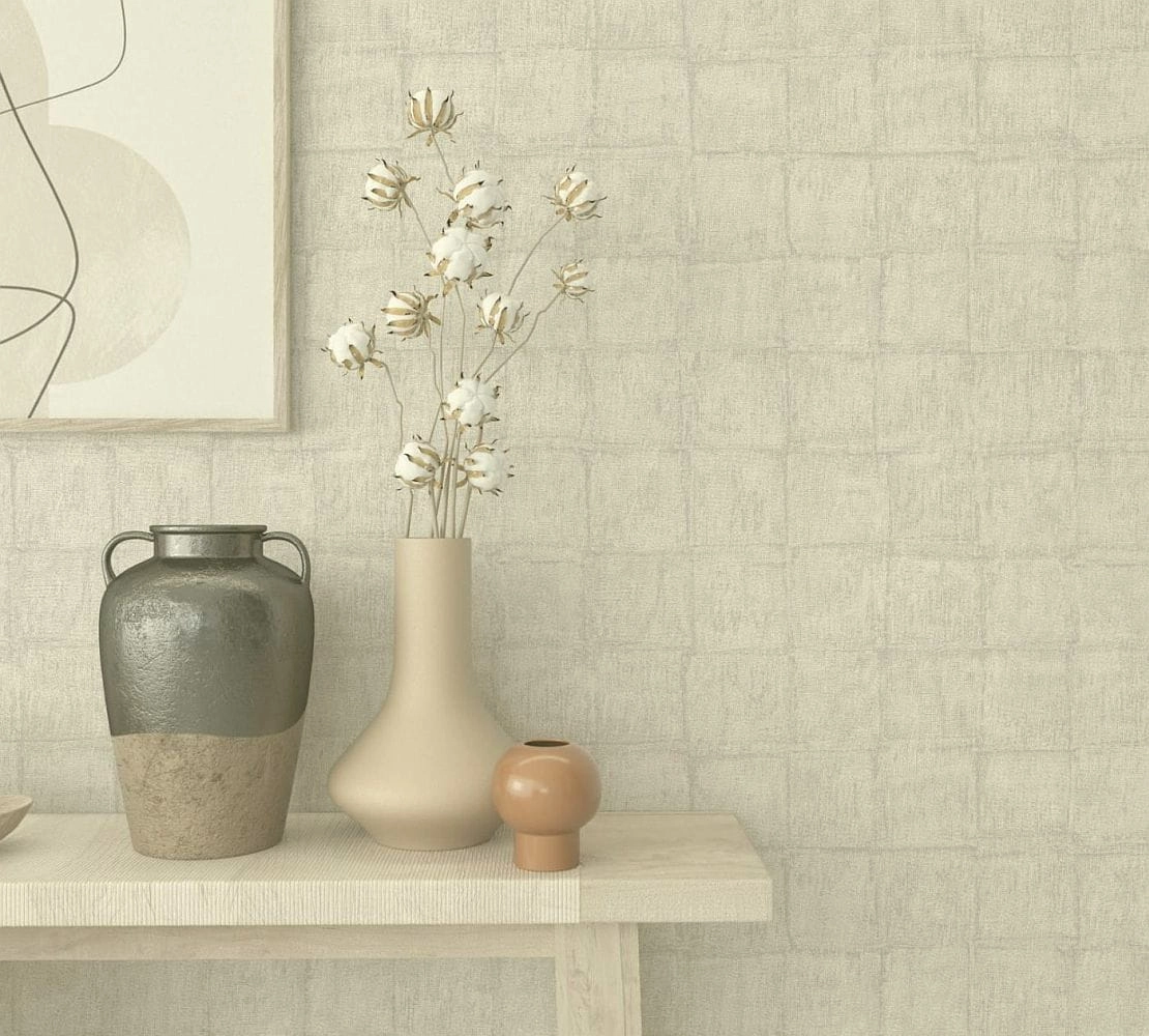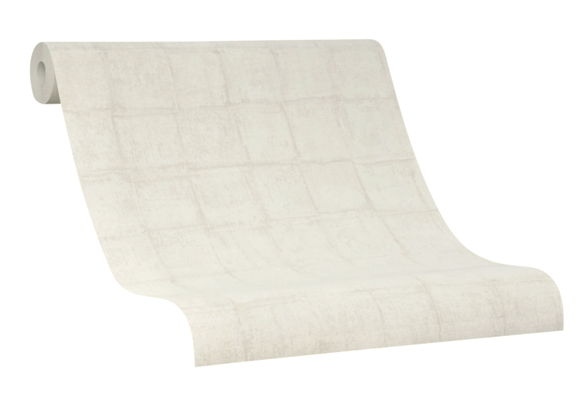 Tapeta ścienna na flizelinie, tynk, beton w kratę w kolorze jasnobeżowym.