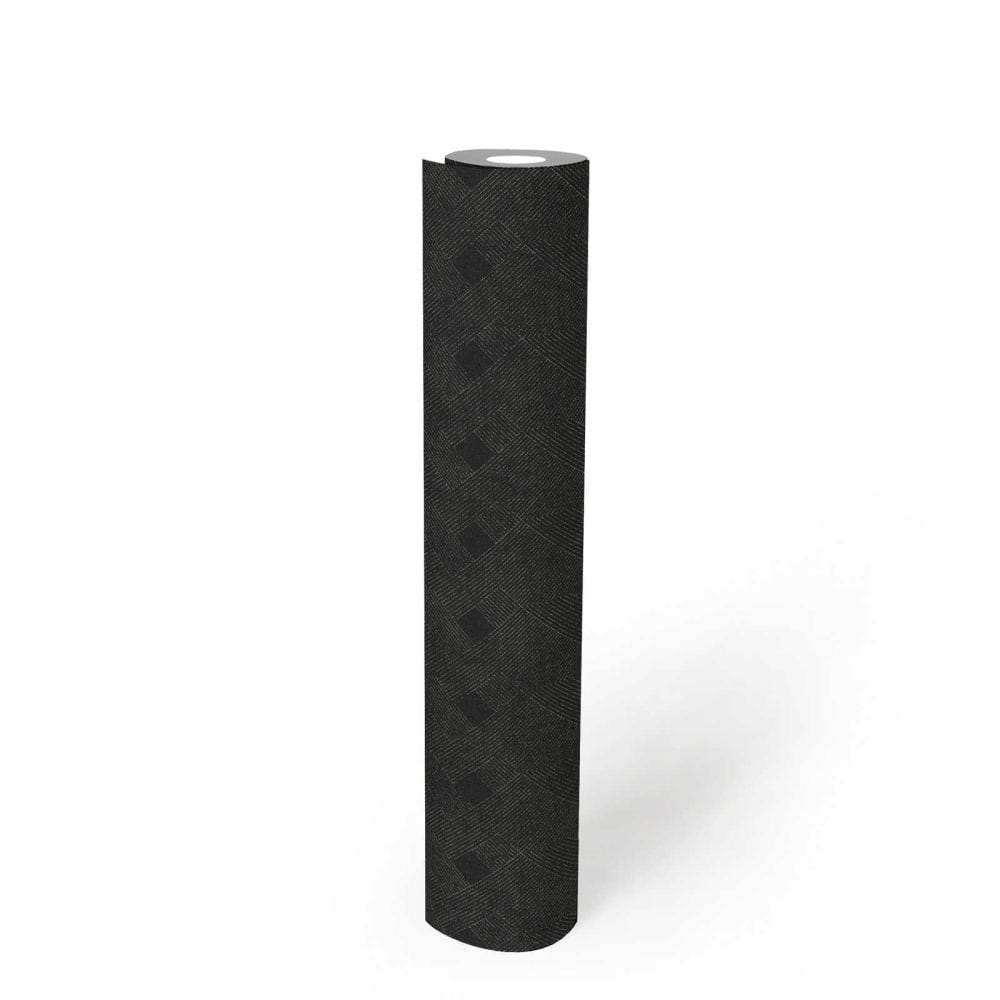 Tapeta występuje w odcieniu czarnym, wzór geometryczny lekko połyskujący złotem.