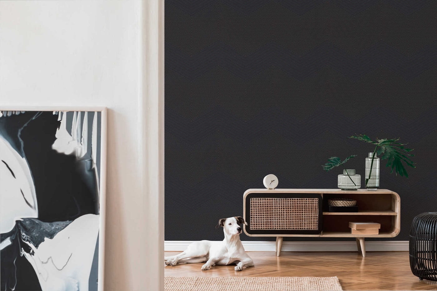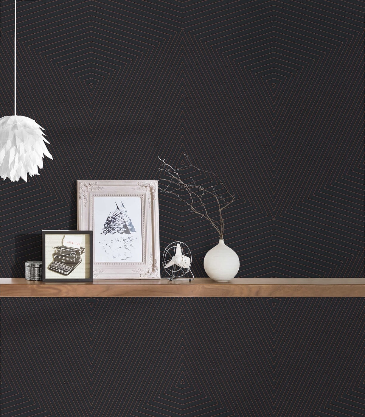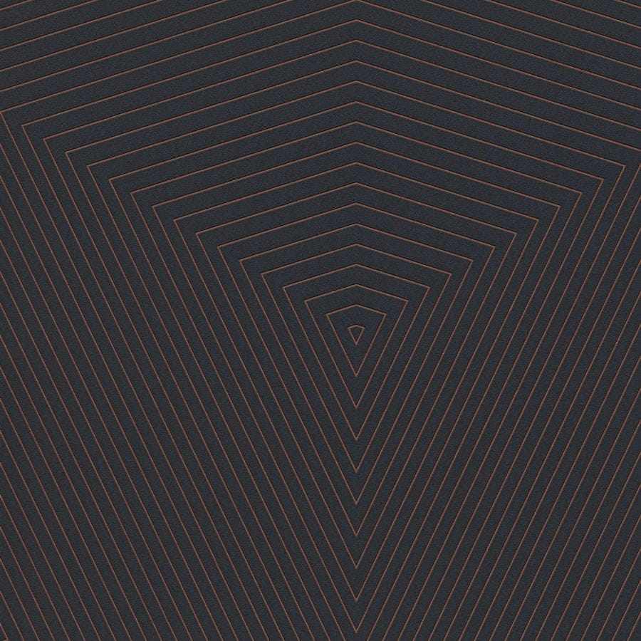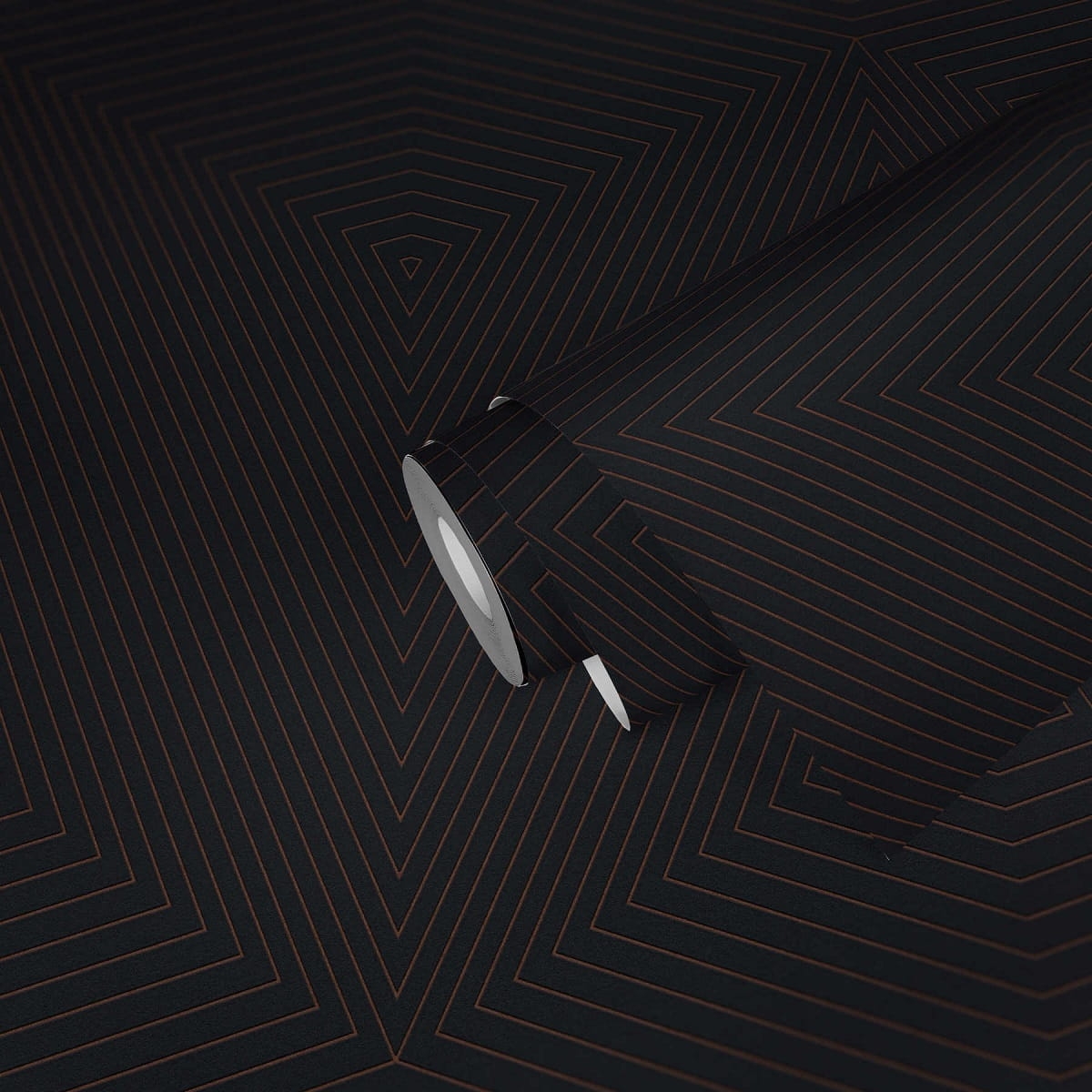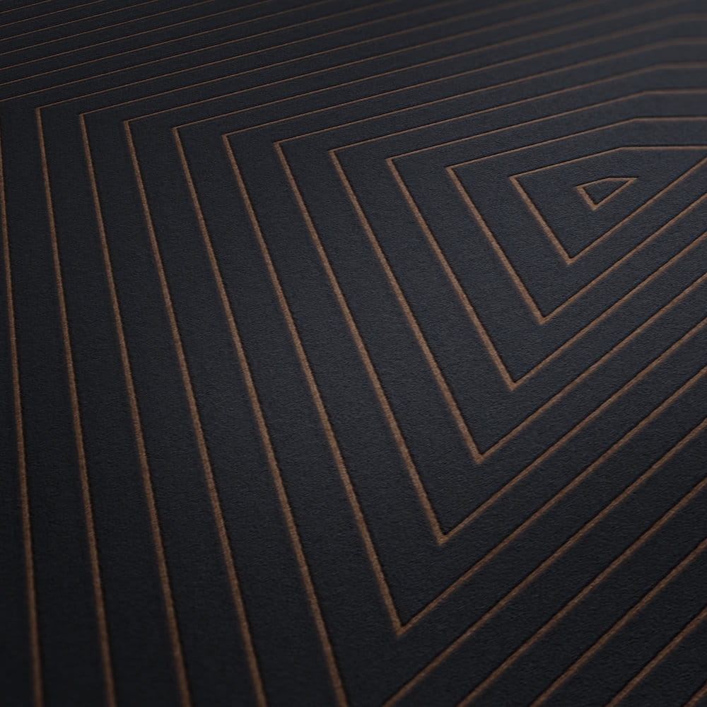 Matowe tło tapety jest w odcieniu czerni, wzór czyli gęste linie tworzące wzór geometryczny w odcieniu delikatnie połyskującego miedzianego złota.