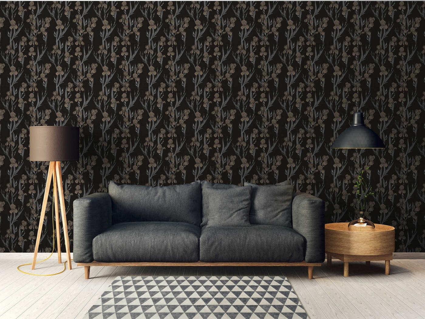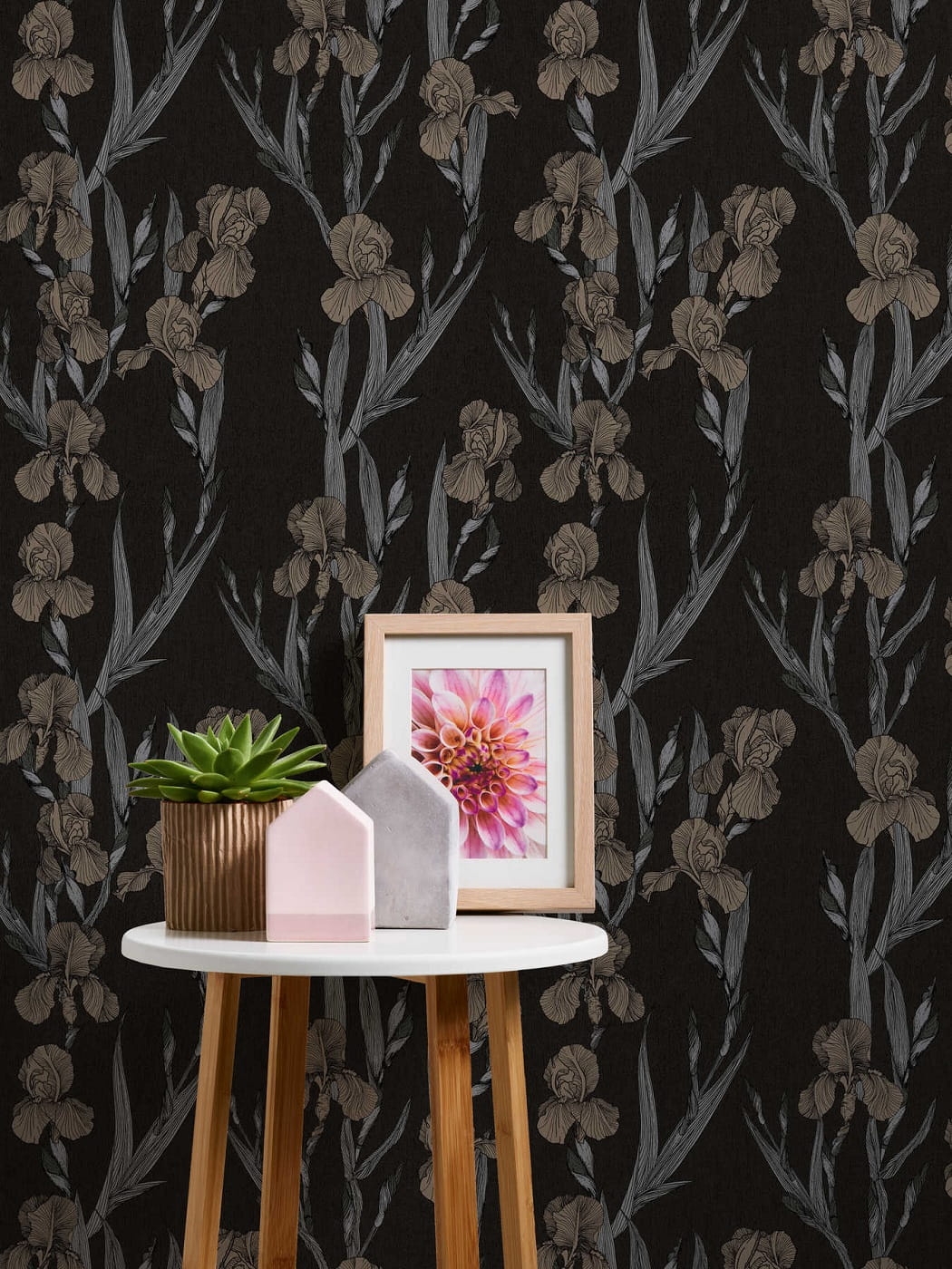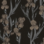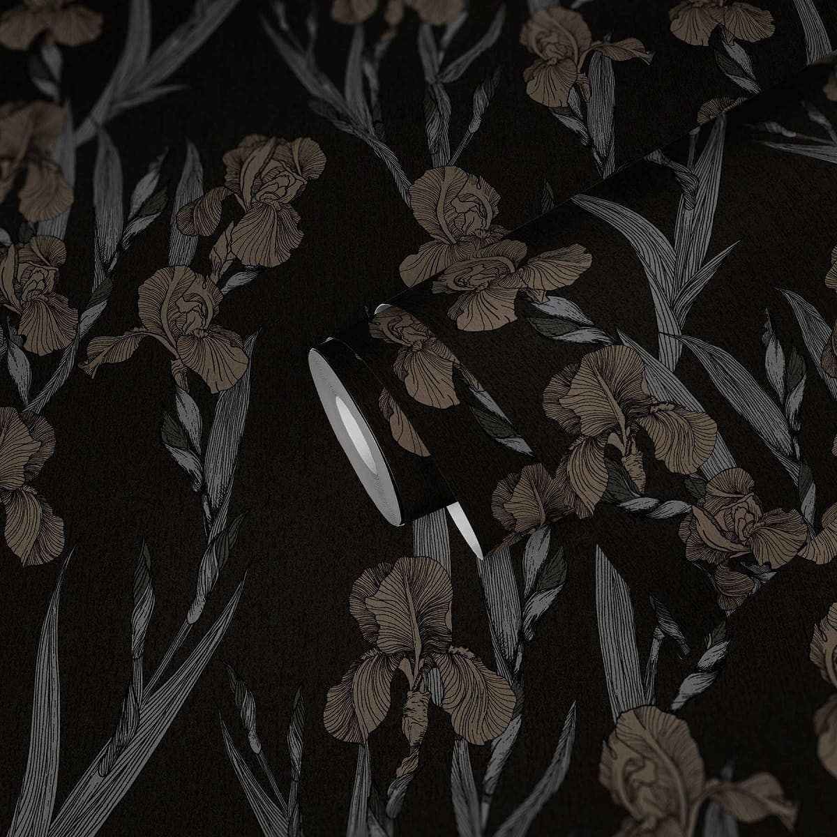 Matowe tło tapety jest w odcieniu czerni, wzór tworzy rysunek kwiatów-irysów w odcieniach szarości i jasnego brązu.