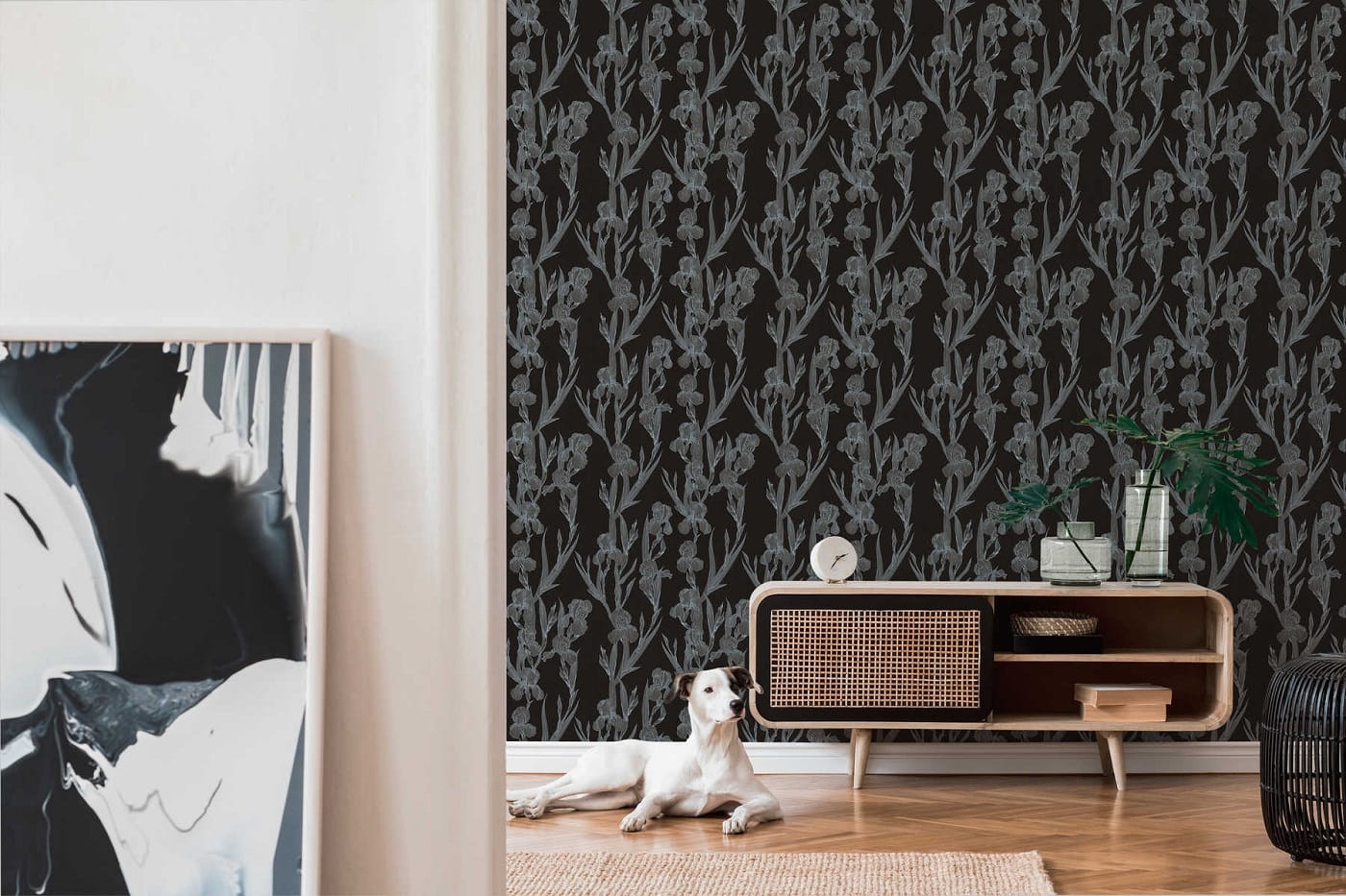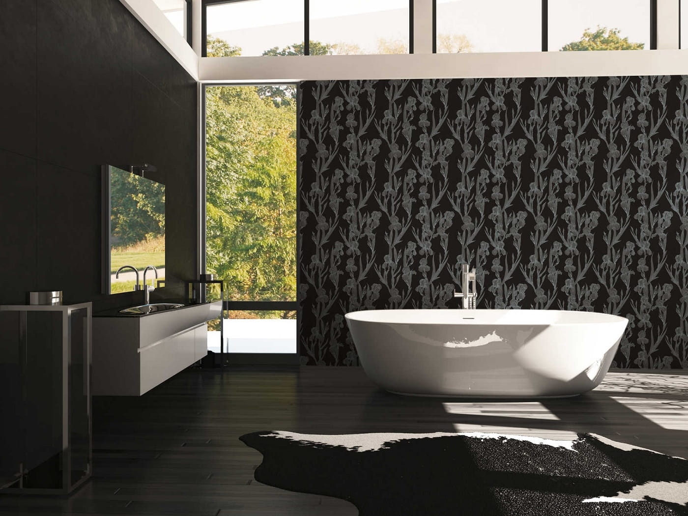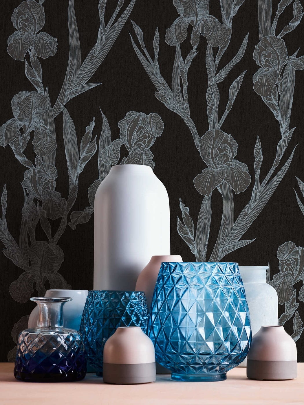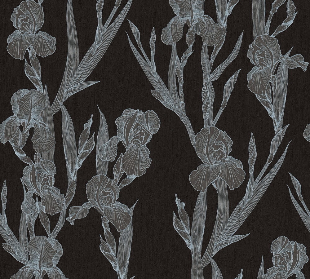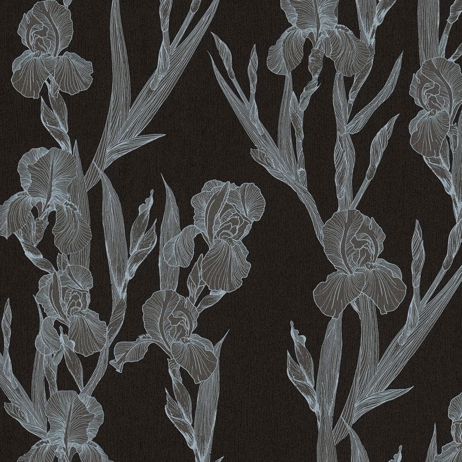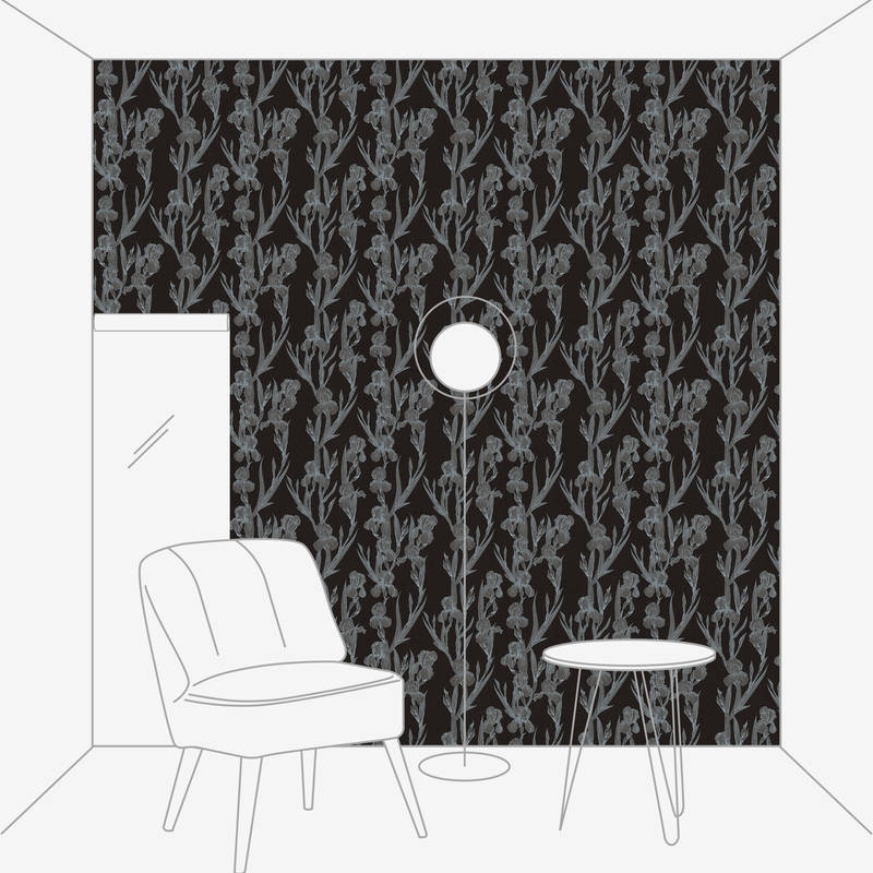 Matowe tło tapety jest w odcieniu czerni, wzór tworzy rysunek kwiatów-irysów w odcieniu szarości.