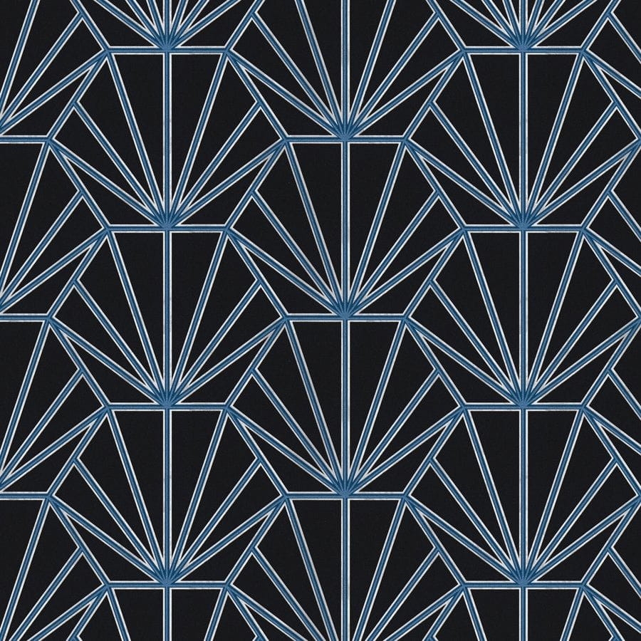 Tapeta w odcieniach czerni, jasnego beżu, niebieskiego metalicznego. Tło w odcieniu czarnym, wzór w odcieniach jasnego beżu i metalicznego niebieskiego.