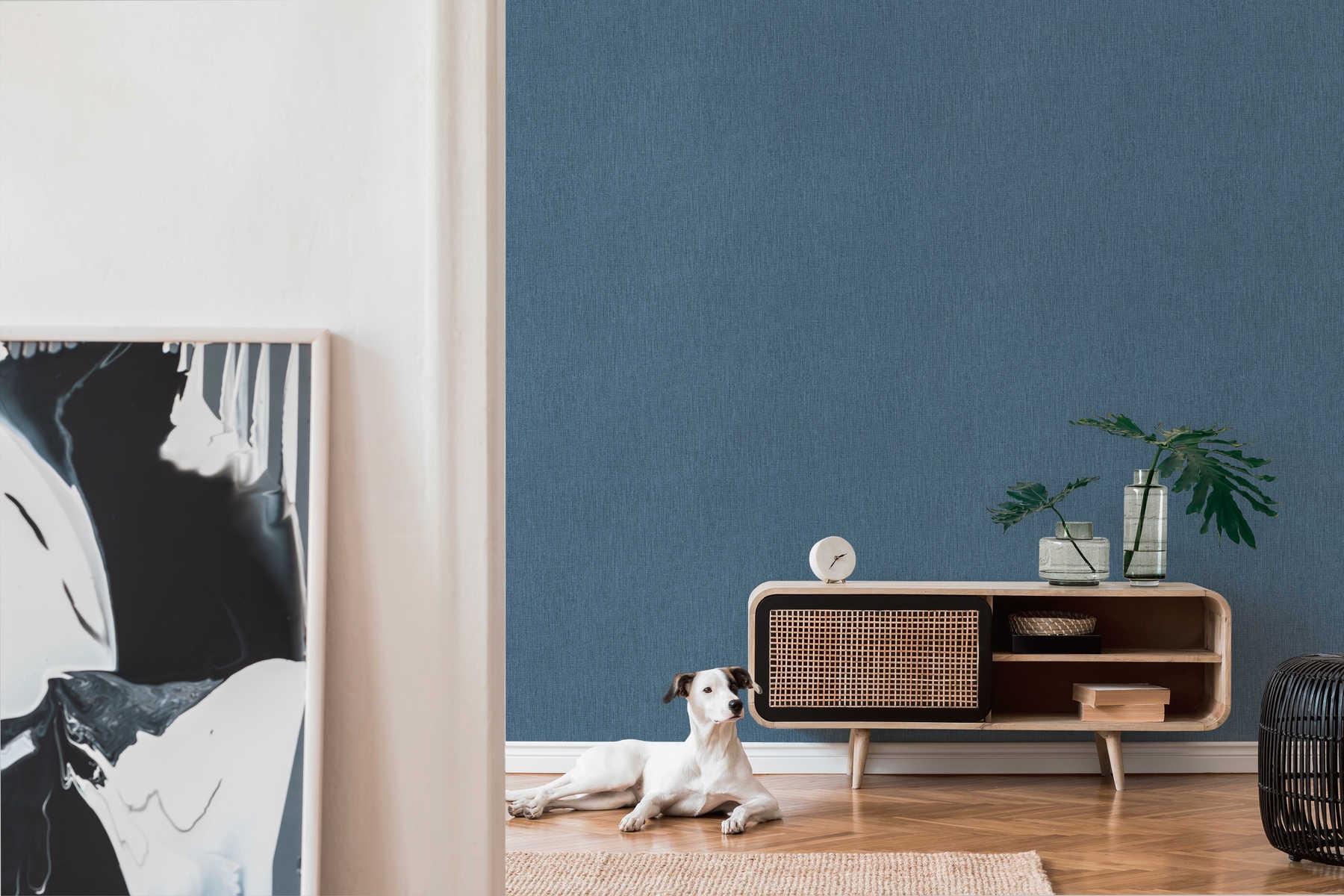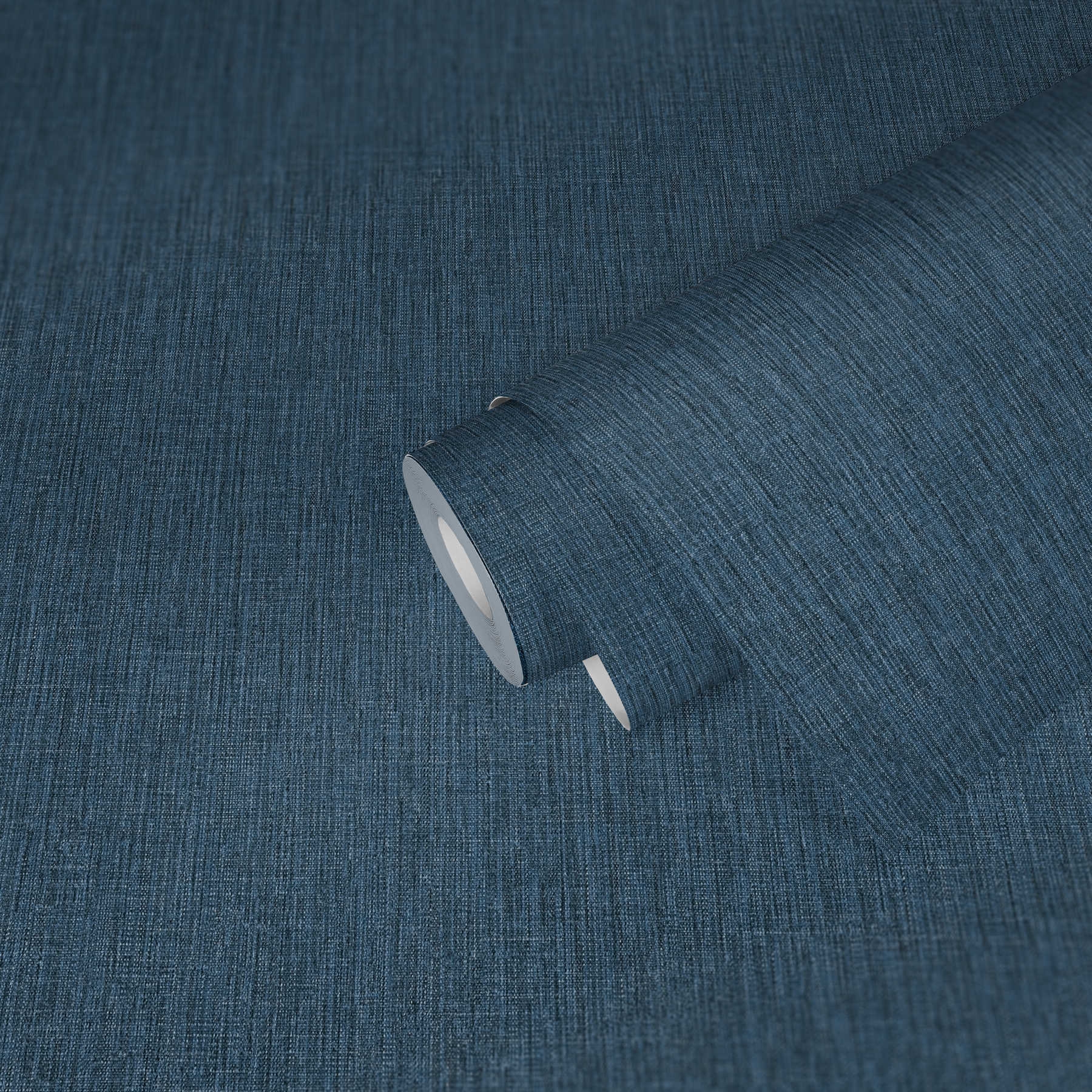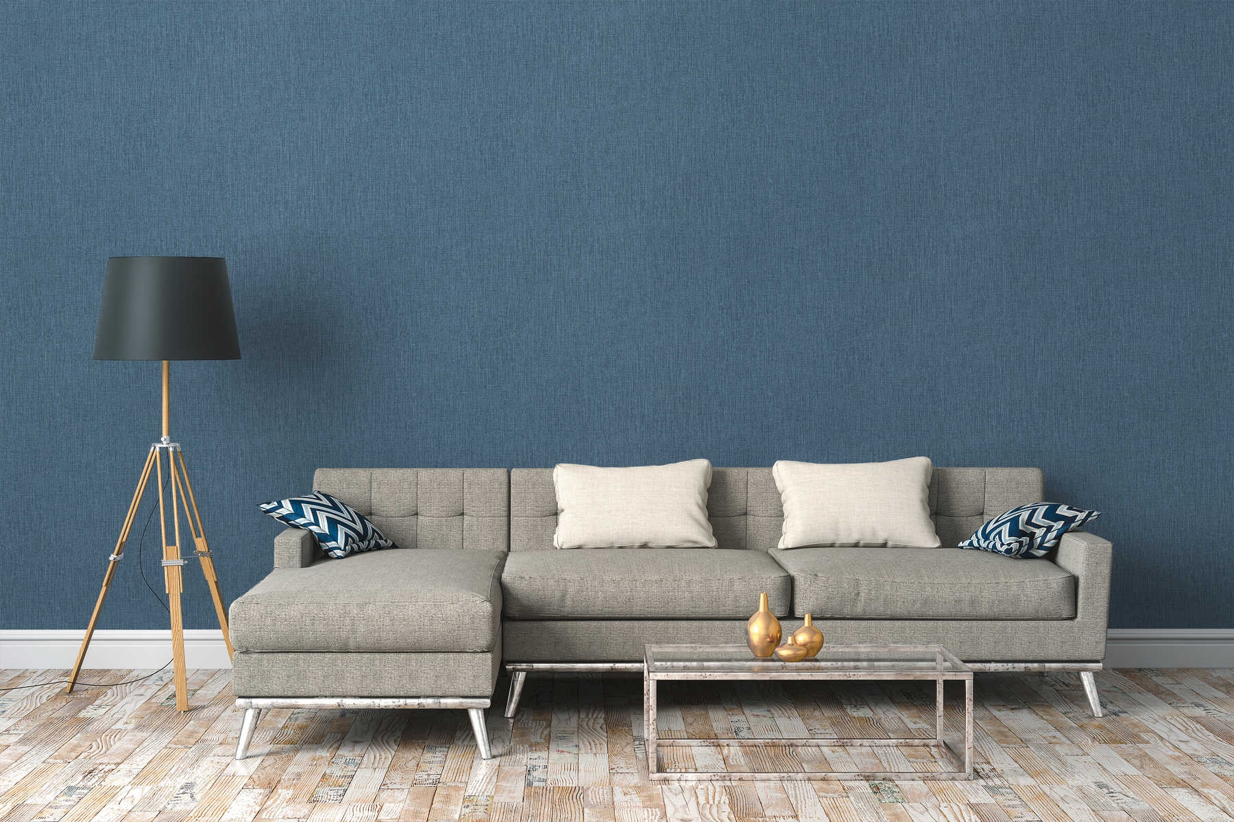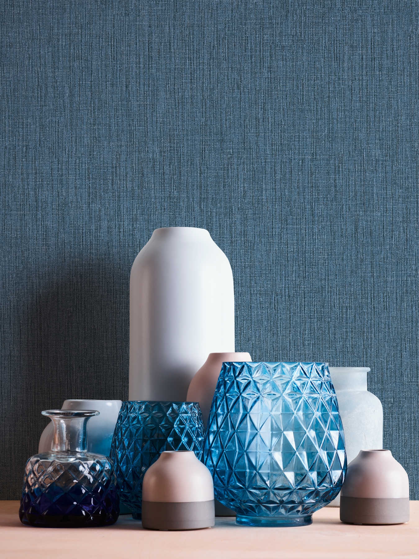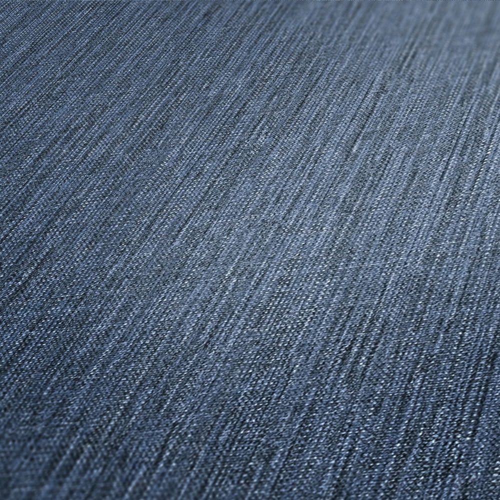 Tapeta w odcieniu ciemno niebieskim, kolor lekko przecierany, imituje tkaninę, widoczne ciemniejsze i jaśniejsze "nitki", podobny do jeansu.