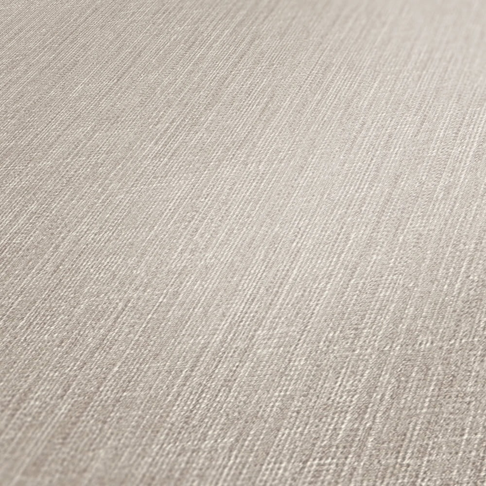 Tapeta w odcieniach jasnego beżu, kolor lekko przecierany, imituje tkaninę, widoczne ciemniejsze i jaśniejsze "nitki".