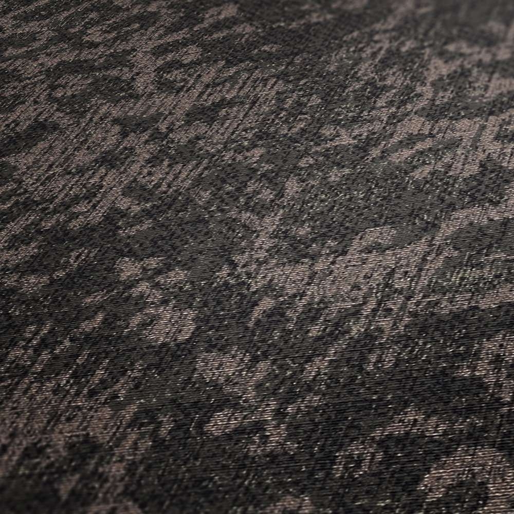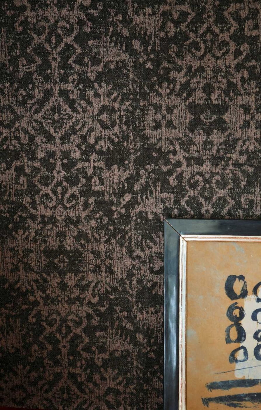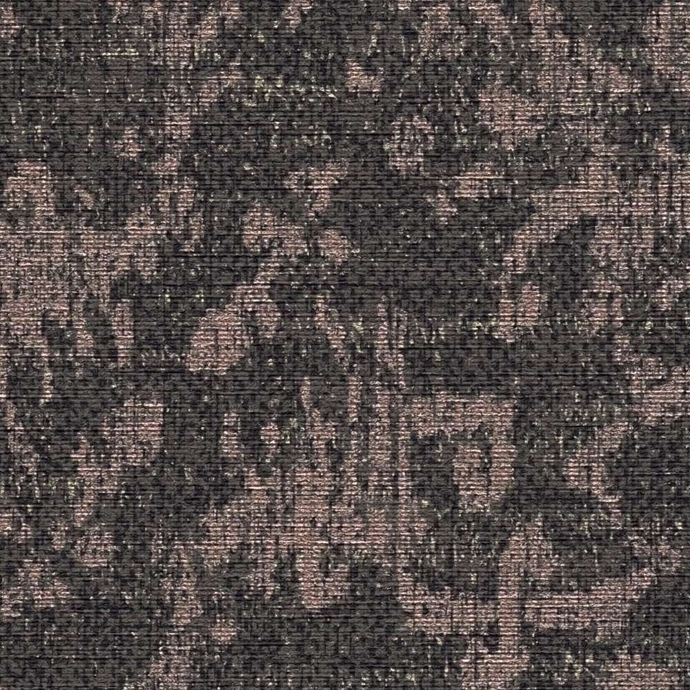 - Kolorystyka: odcień ciemnobrązowy, tło tapety matowe z drobinkami odcienia złotego, ornament beżowo-brudno-różowy o satynowym połysku