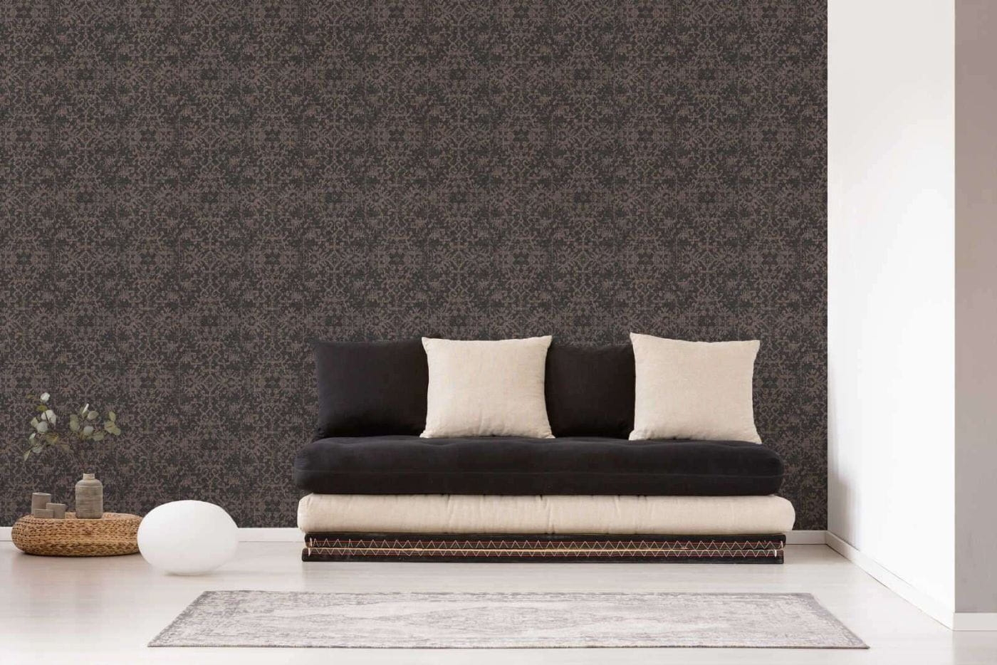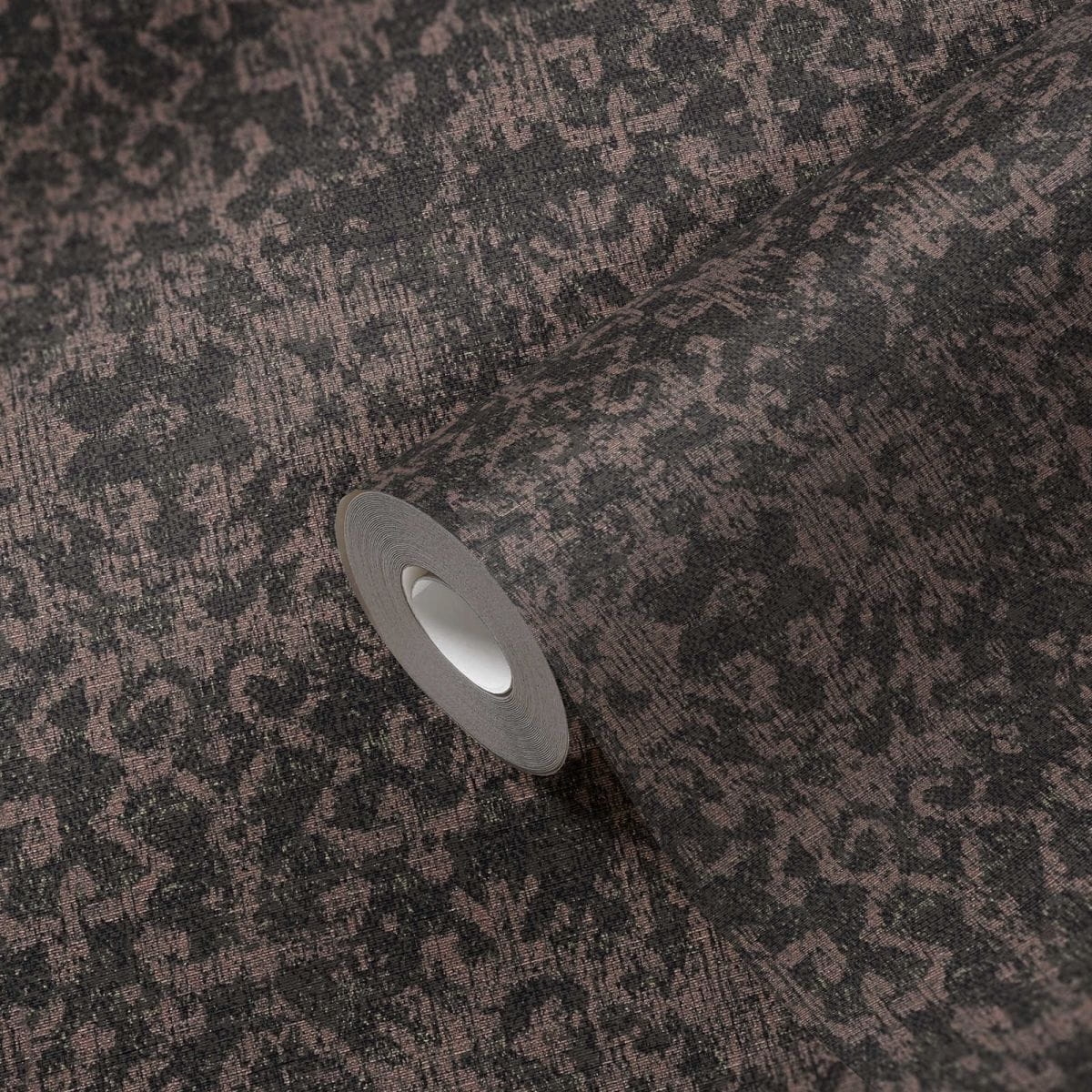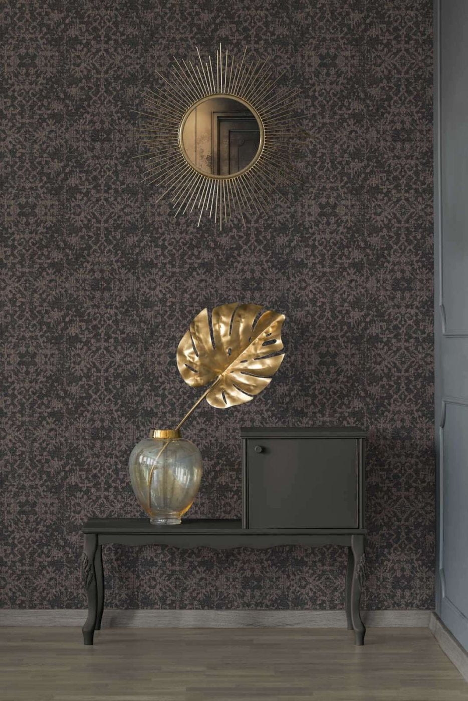 - Kolorystyka: odcień ciemnobrązowy, tło tapety matowe z drobinkami odcienia złotego, ornament beżowo-brudno-różowy o satynowym połysku
