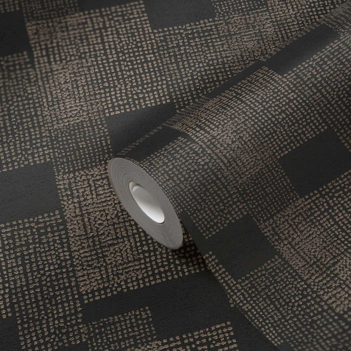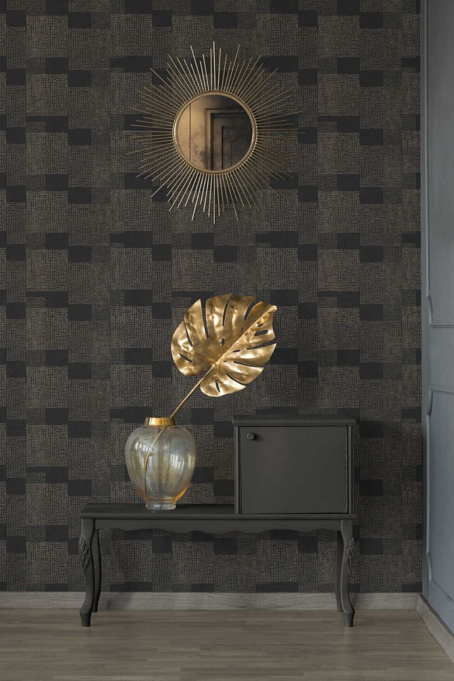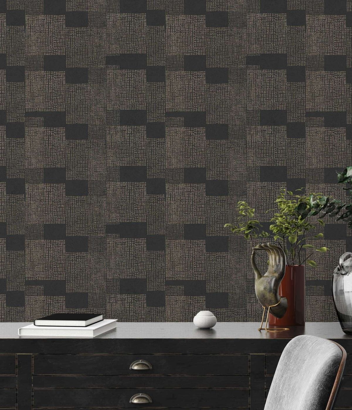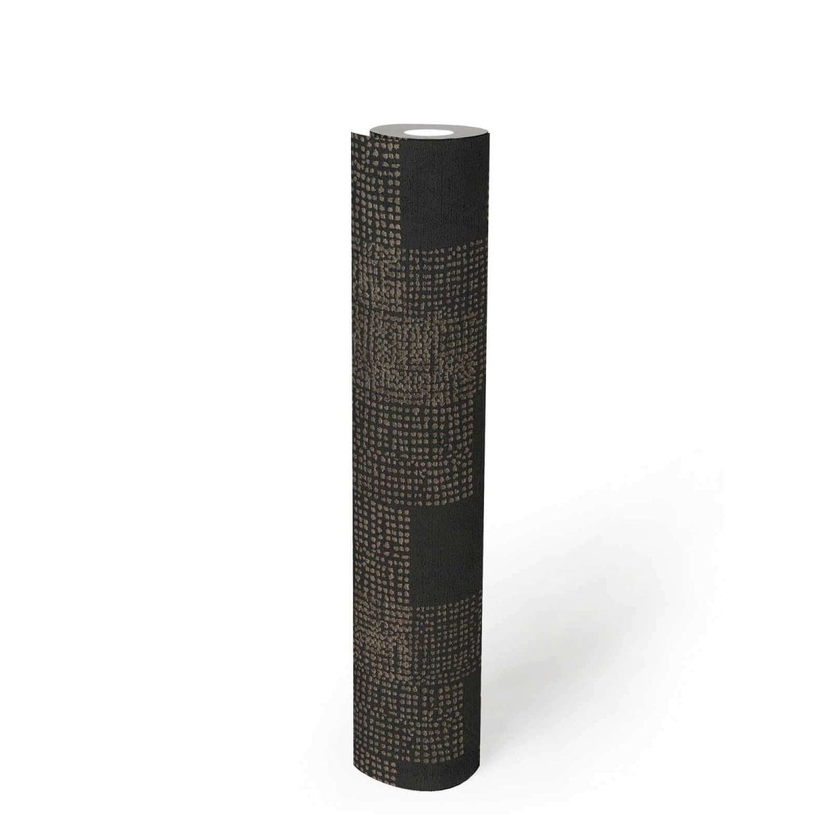- Kolorystyka: odcienie ciemnego brązu, wenge i piaskowego, tło tapety matowe, wzór pokryty delikatną złotą satyną