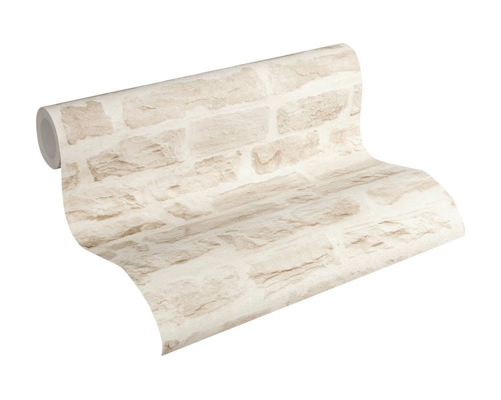 Tapeta niemieckiego producenta AS Creation przedstawiająca bardzo realistyczny mur kamienny w jasnobeżowym kolorze.