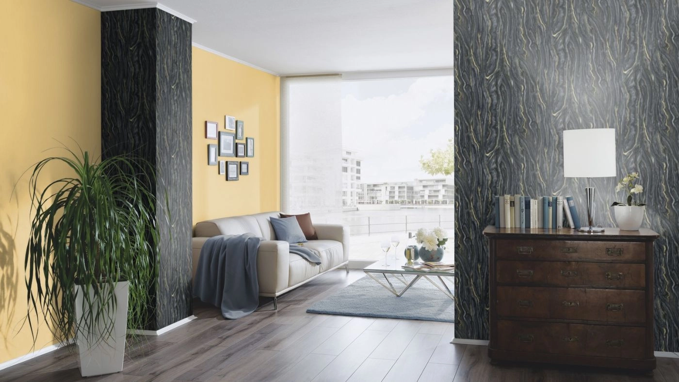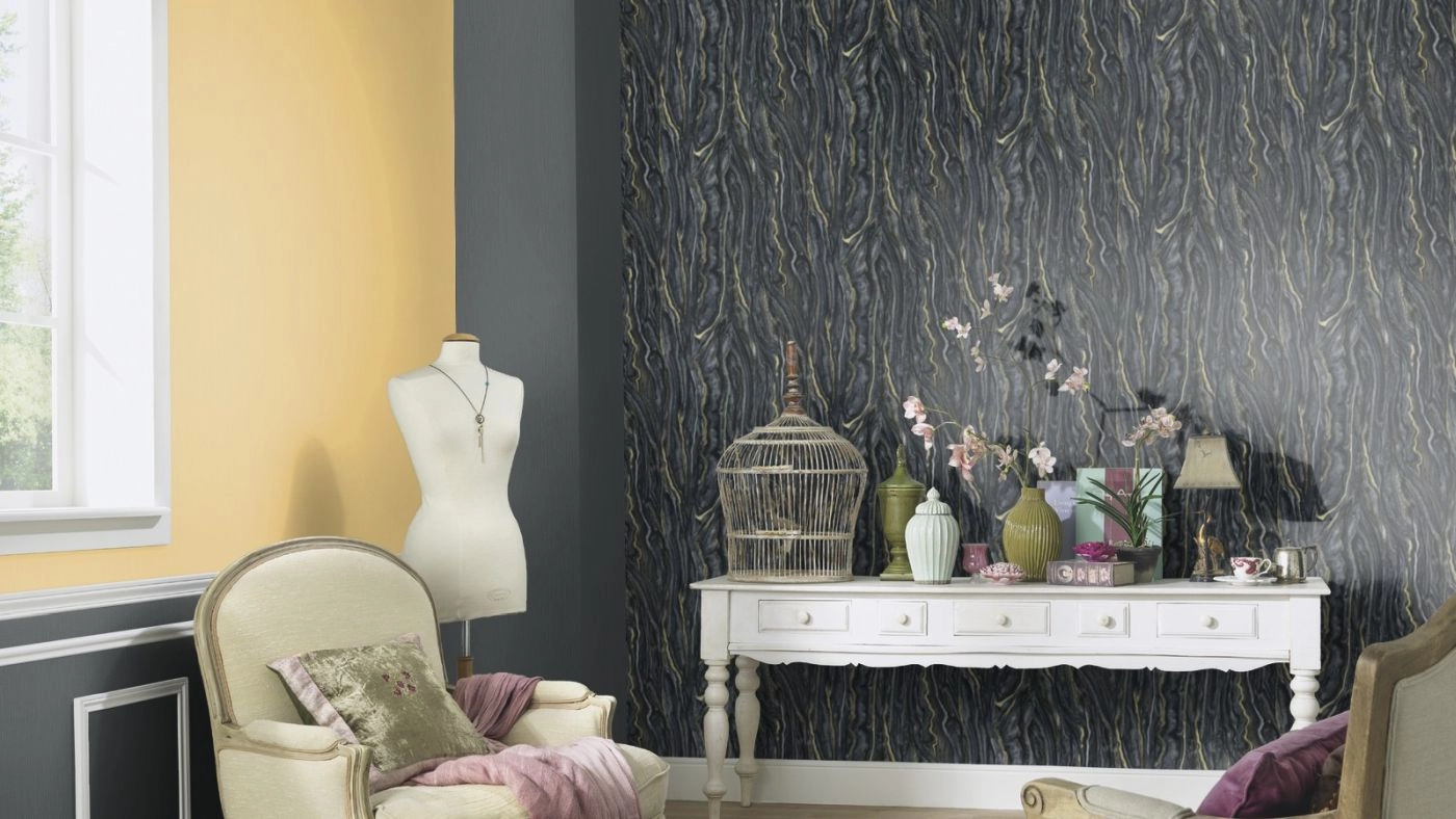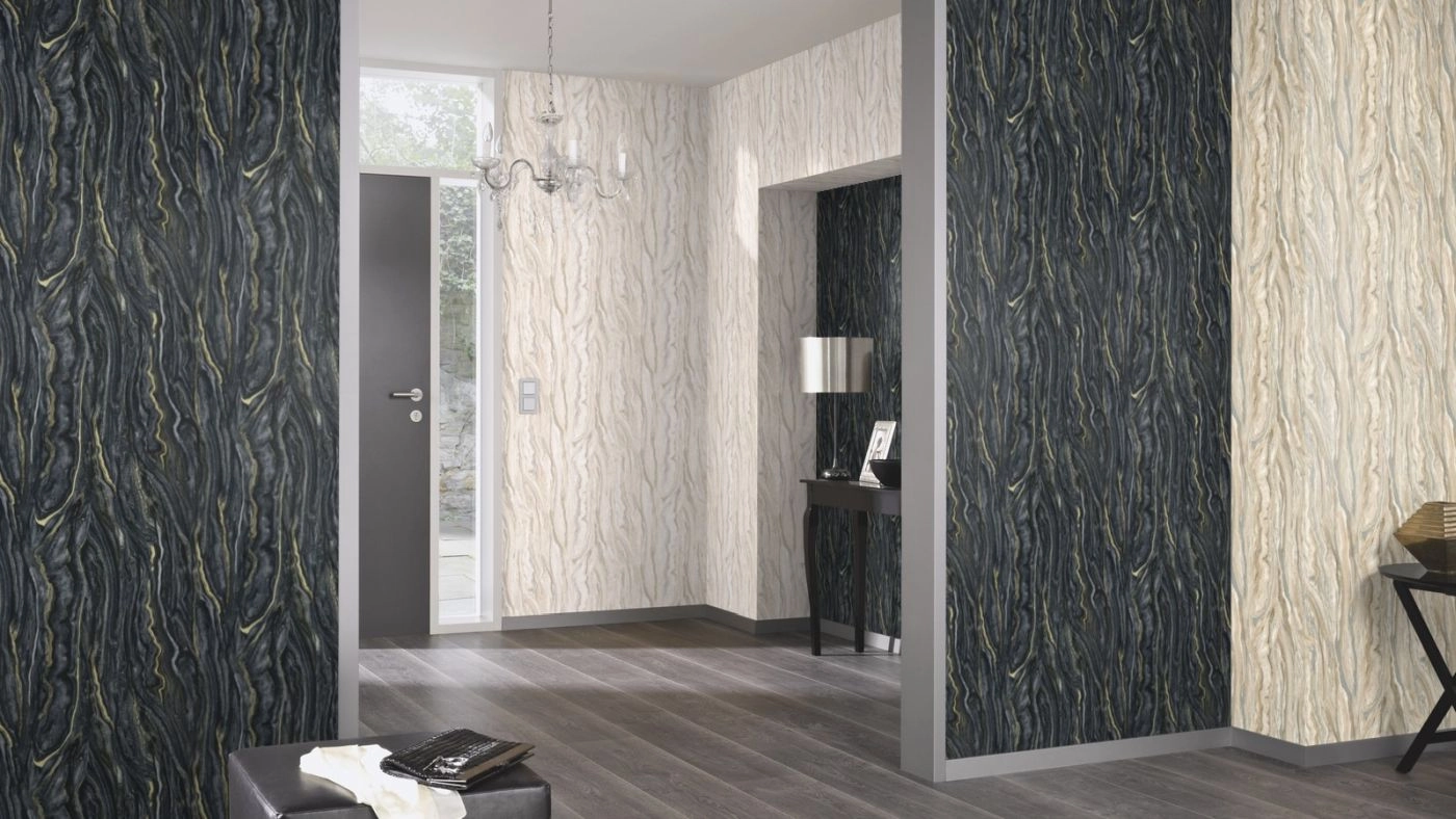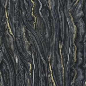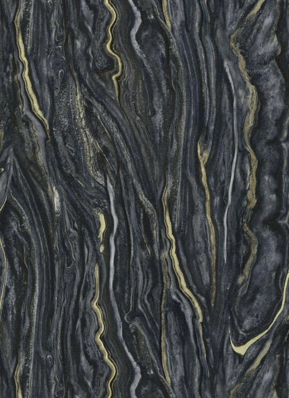Wzór na tapecie tworzy wyraźny, przepiękny motyw imitujący naturalny marmur w odcieniach antracytu, czarnego i złota. Odzwierciedlony w najdrobniejszym szczególe wygląda bardzo realistycznie. Dodatek satynowego złota dodaje tej tapecie elegancji, sprawia, że jest wyjątkowa, podkreśla piękno i charakter tego wzoru. Aranżacja doskonale sprawdzi się we wnętrzach urządzanych w stylu nowoczesnym, jednak w połączeniu z pasującymi jednobarwnymi tłami z kolekcji będzie piękną ozdobą również klasycznych, czy też w stylu glamour, pomieszczeń.