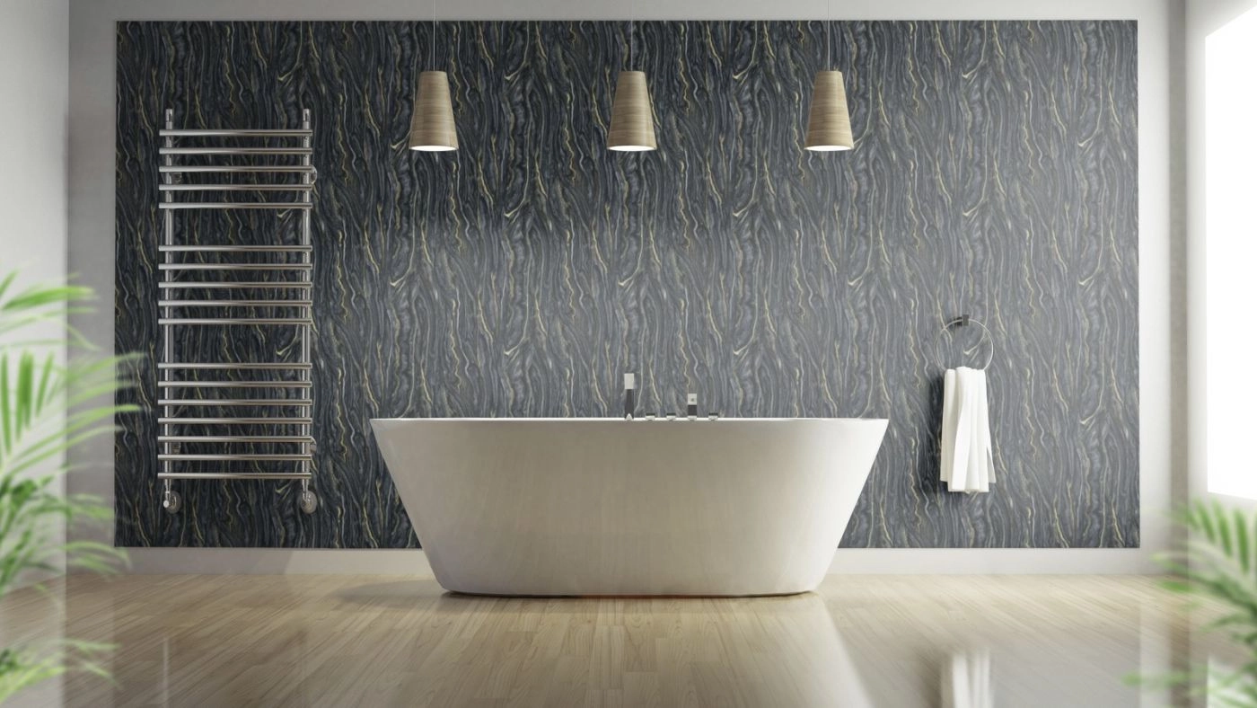 Tapeta ścienna w antracytowo-czarny marmur prezentuje się dobrze zarówno w pomieszczeniach, w których spędza się większość wolnego czasu - jak salon i sypialnia, ale również w przedpokoju, czy jadalni. Wzór jest nowoczesny, prosty i na tyle elastyczny, że na pewno sprawdzi się wszędzie, gdzie tylko go potrzebujesz.