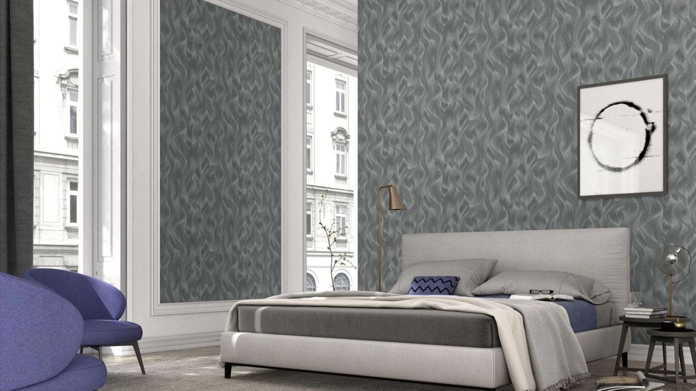 Wzór na tapecie tworzy wyraźnie przecierany odcień stalowy doskonale imitujący falowane włosy, bądź ogniste płomienie... Niektóre prążki dodatkowo pokryte metalizującym, srebrnym odcieniem powoduję, że tapeta mieni się jeśli patrzymy na nią z innej perspektywy... Aranżacja doskonale sprawdzi się w nowoczesnych wnętrzach, jednak w połączeniu z pasującymi jednobarwnymi tłami z kolekcji będzie piękną ozdobą również klasycznych, barokowych pomieszczeń.