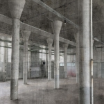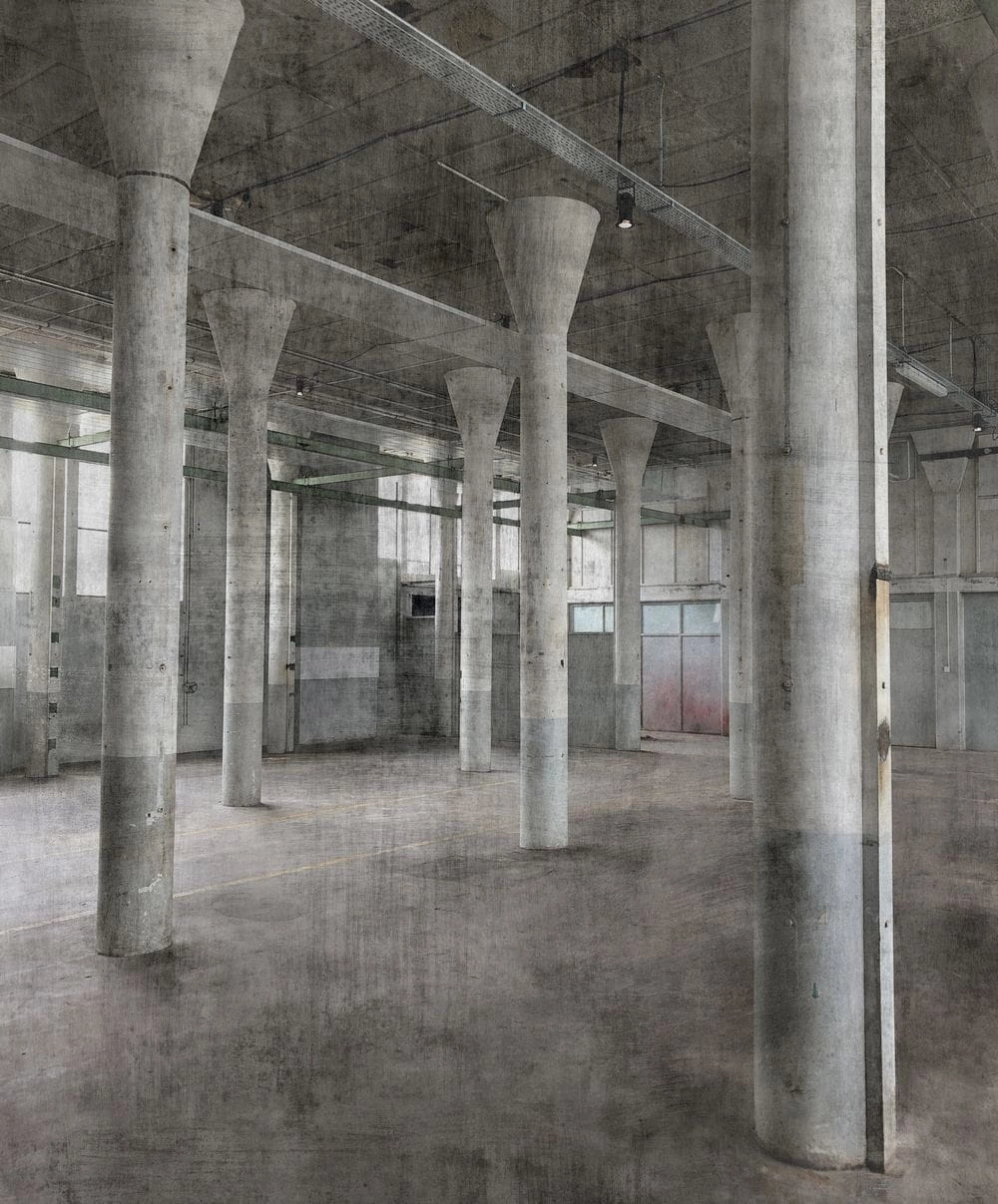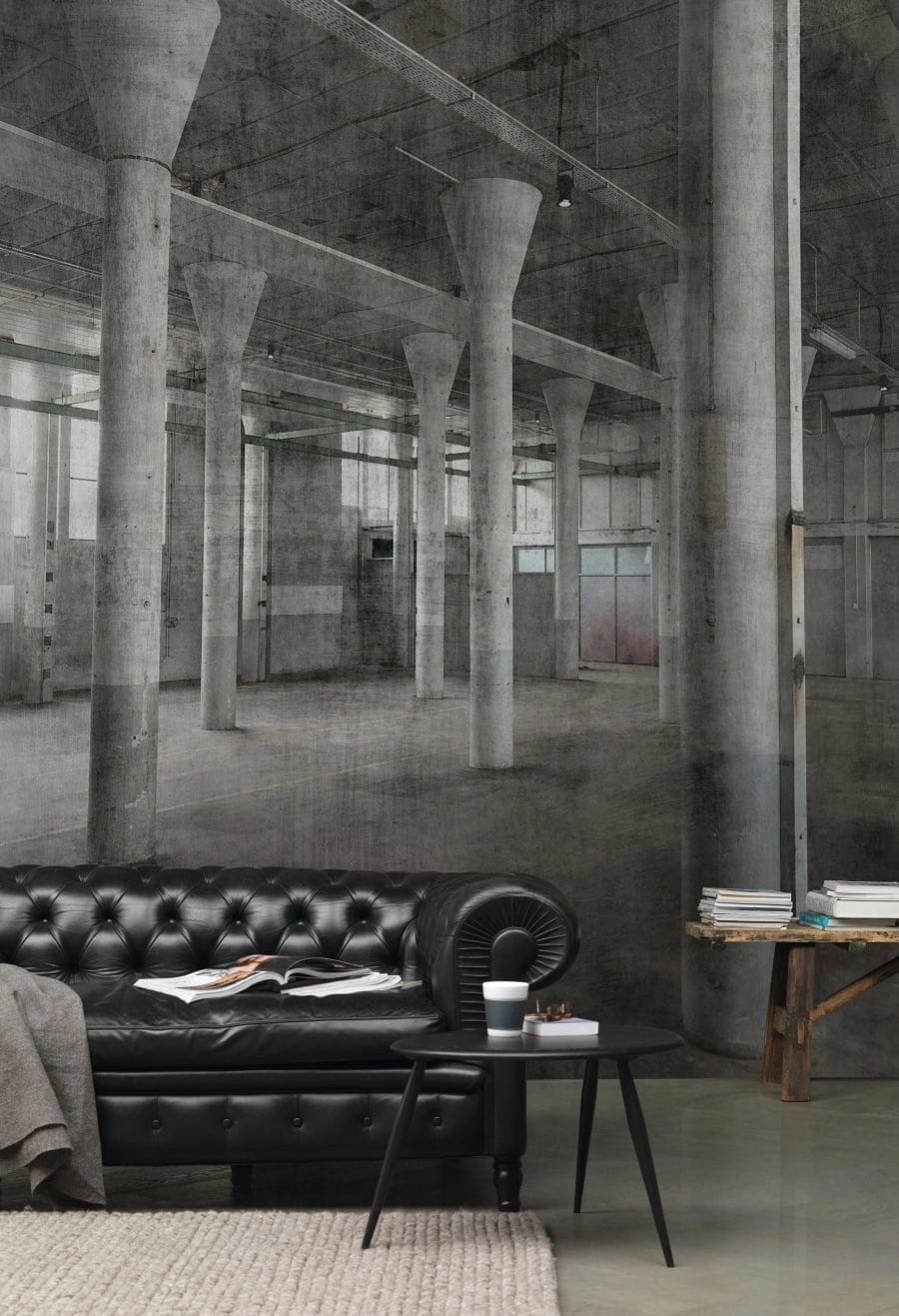 Tapeta w formie dekoracyjnego panelu firmy Rasch, to ciekawa propozycja na ozdobienie jednej ściany, lub wybranego fragmentu. Mural składa się z pięciu części o szer. 50cm, tworząc dekorację o wymiarach 3,00m (wysokość) i 2,50m (szerokość). Mural jest w naturalnych, stonowanych odcieniach szarego, grafitu i białego. Widzimy tutaj w z zachowaniem najdrobniejszych szczegółów wnętrze starego, wysokiego pomieszczenia - fabryki, z perspektywy pokazujęcej kolumny podtrzymujące strop, cześć ścian i część podłogi - w stylu industrialnym... Tapeta jest wykonana z fotograficzną dokładnością, wyjątkowo realistyczna, pozwalająca przenieść się do czasów ubiegłego wieku... Całość tworzy ciekawą alternatywę do tapet, tworząc aranżację jedyną w swoim rodzaju, która przyciąga wzrok i dobrze dopasuje się do jednobarwnych tapet/farb, jak również do różnego rodzaju stylizacji, kreując wnętrza pełne niepowtarzalnego klimatu w stylu loftowym.