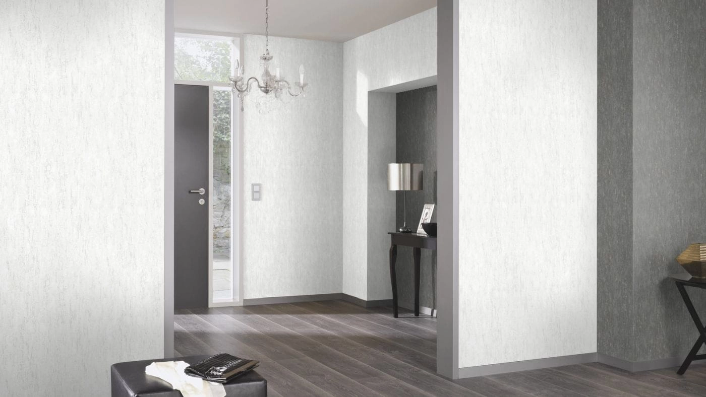 - Struktura tapety: powierzchnia lekko tłoczona, o nieregularnej fakturze z pionowymi przetarciami, miejscami lekko połyskująca srebrem