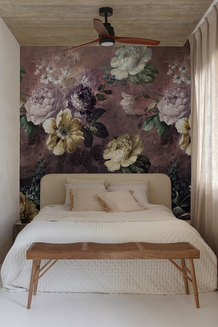 Wyrazista, dekoracyjna tapeta z motywem dużych, malarsko przedstawionych kwiatów wprowadza do wnętrza elegancję inspirowaną klasycznym malarstwem. Bogata kompozycja piwonii i drobnych kwiatów została ukazana na głębokim, przydymionym tle w odcieniach śliwki i brązu, co podkreśla kontrast jasnych płatków oraz subtelnych zieleni liści. Artystyczne pociągnięcia pędzla nadają wzorowi szlachetny, lekko nostalgiczny charakter i tworzą efekt dekoracyjnej głębi.