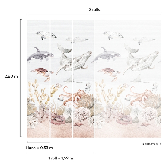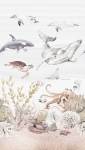 Tapeta ścienna Grandeco A71601 Sea Life przedstawia spokojną, ilustracyjną scenę z życia oceanu. Wieloryb, delfiny, żółw morski, ośmiornica i drobne ryby unoszą się nad rafą koralową, tworząc lekką, harmonijną kompozycję inspirowaną naturą.