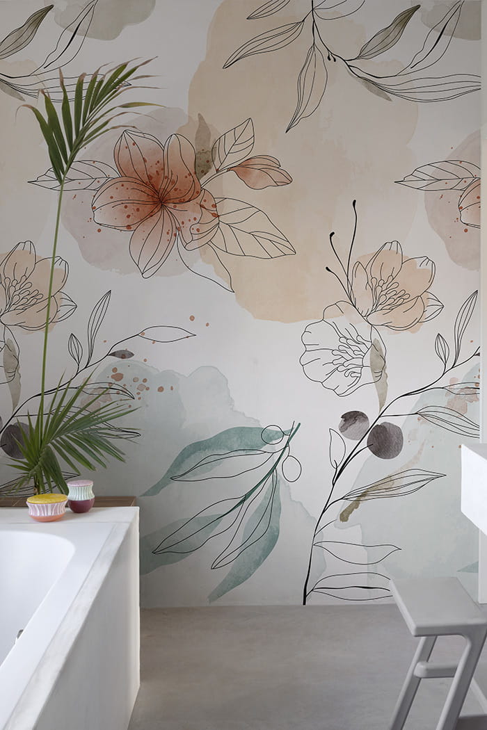 Subtelna kompozycja kwiatowa w formie delikatnego line art połączona z miękkimi, akwarelowymi plamami tworzy elegancki i lekki wizualnie wzór dekoracyjny. Cienka, graficzna linia roślin i kwiatów harmonijnie kontrastuje z rozmytymi tłami w odcieniach beżu, szałwii i przygaszonego błękitu, nadając całości nowoczesny, artystyczny charakter. Jasne tło podkreśla minimalizm kompozycji i wprowadza do wnętrza wrażenie przestrzeni oraz spokoju.