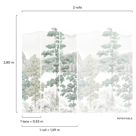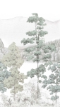 Spokojna kompozycja przedstawiająca smukłe drzewa na tle górskiego krajobrazu i jeziora tworzy elegancki, ponadczasowy motyw inspirowany naturą. Delikatne, pastelowe odcienie zieleni i szarości oraz subtelna, ilustracyjna kreska nadają wzorowi lekkości i wyciszającego charakteru. Jasne tło optycznie rozjaśnia przestrzeń, a harmonijna kolorystyka sprzyja relaksowi i wprowadza do wnętrza atmosferę spokoju.