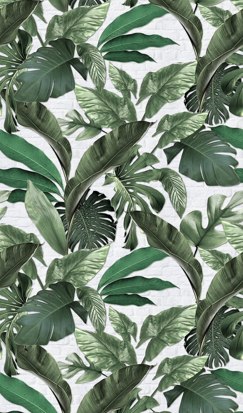 Mural ścienny 3D duże liście na ścianie z białej cegły