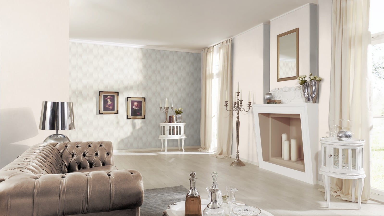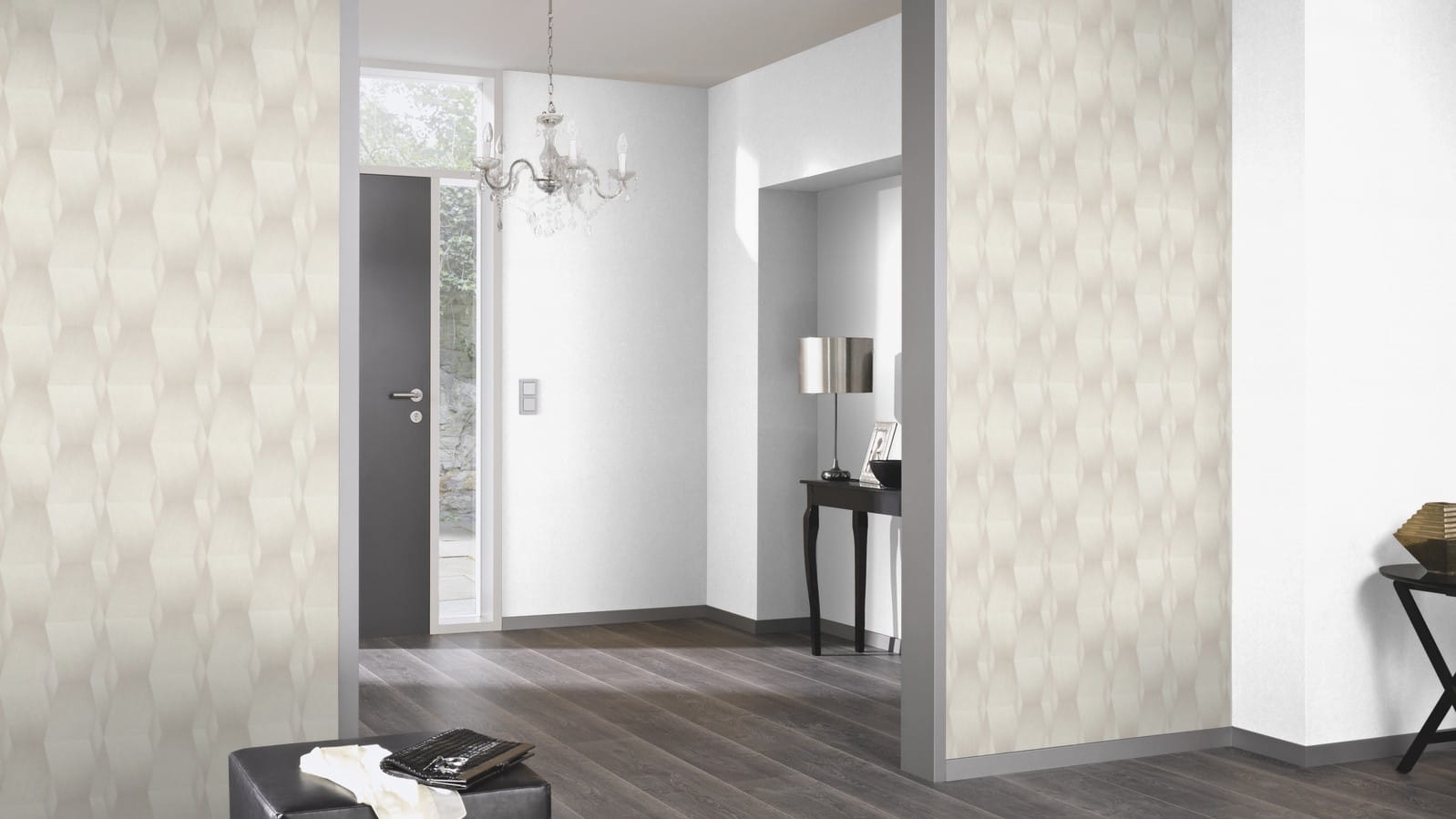 Na tapecie są wzory geometryczne w formie równoległoboków. Sposób łączenia z kolejną figurą o odpowiednim cieniu kolorystyki oraz nachyleniu figury, tworzy się wizualny obraz 3D. Efekt jest powalający, ponieważ zastosowana kolorystyka to kremowy metaliczny, przez co wzór ten jest bardzo interesujący. Wraz z każdym nachyloną figurą widoczne są delikatne prążki, dzięki czemu całość zapiera dech w piersiach. Tapeta pasuje do stylu nowoczesnego a jej zastosowanie jest uniwersalne.