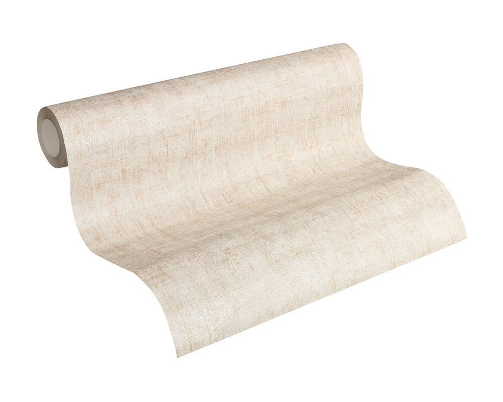Ta delikatnie tłoczona tapeta, o lnianej strukturze i metalicznym wyglądzie ma intensywny efekt ze względu na nakrapiany wzór w kolorze perłowym i jasnobeżowym z delikatnymi, pionowymi, złotymi kreseczkami.