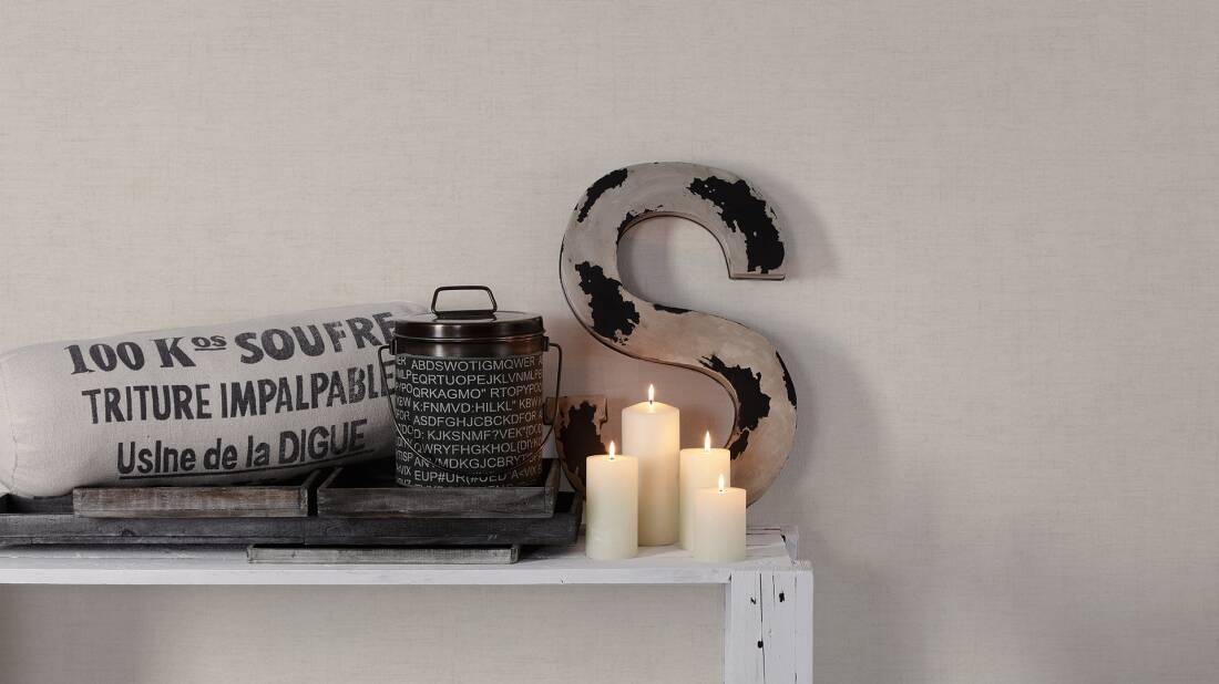 Ta delikatnie tłoczona tapeta, o lnianej strukturze i satynowym wyglądzie ma intensywny efekt ze względu na nakrapiany wzór w kolorze perłowym, imitując zacierany, ozdobny tynk. Kolor tapety niejednolity, przecierany z delikatnymi ciemniejszymi kreseczkami. Całość pociągnięta jedną warstwą jakby lakieru, dzięki czemu tapeta delikatnie połyskuje w zależności od kąta padającego światła.