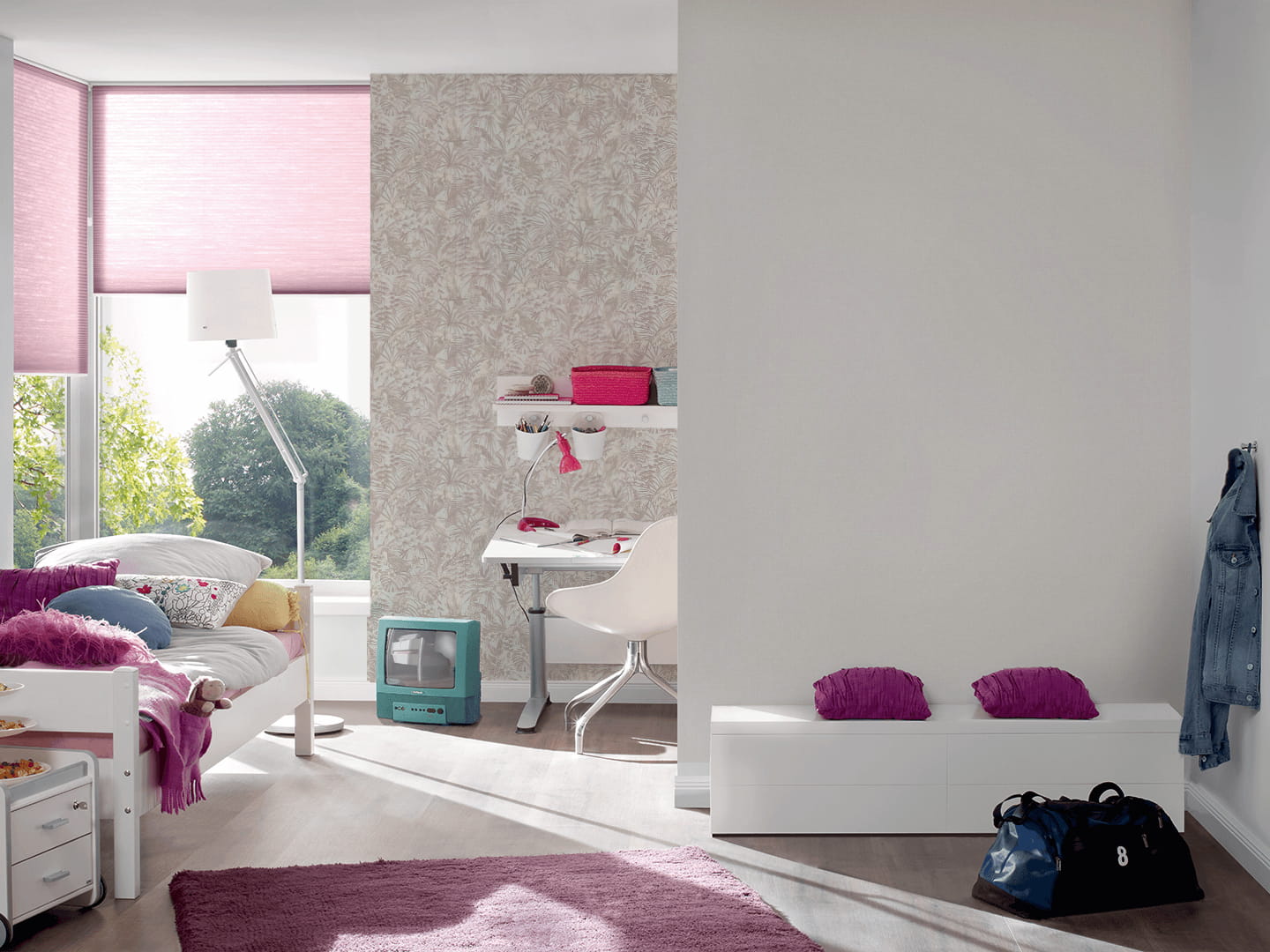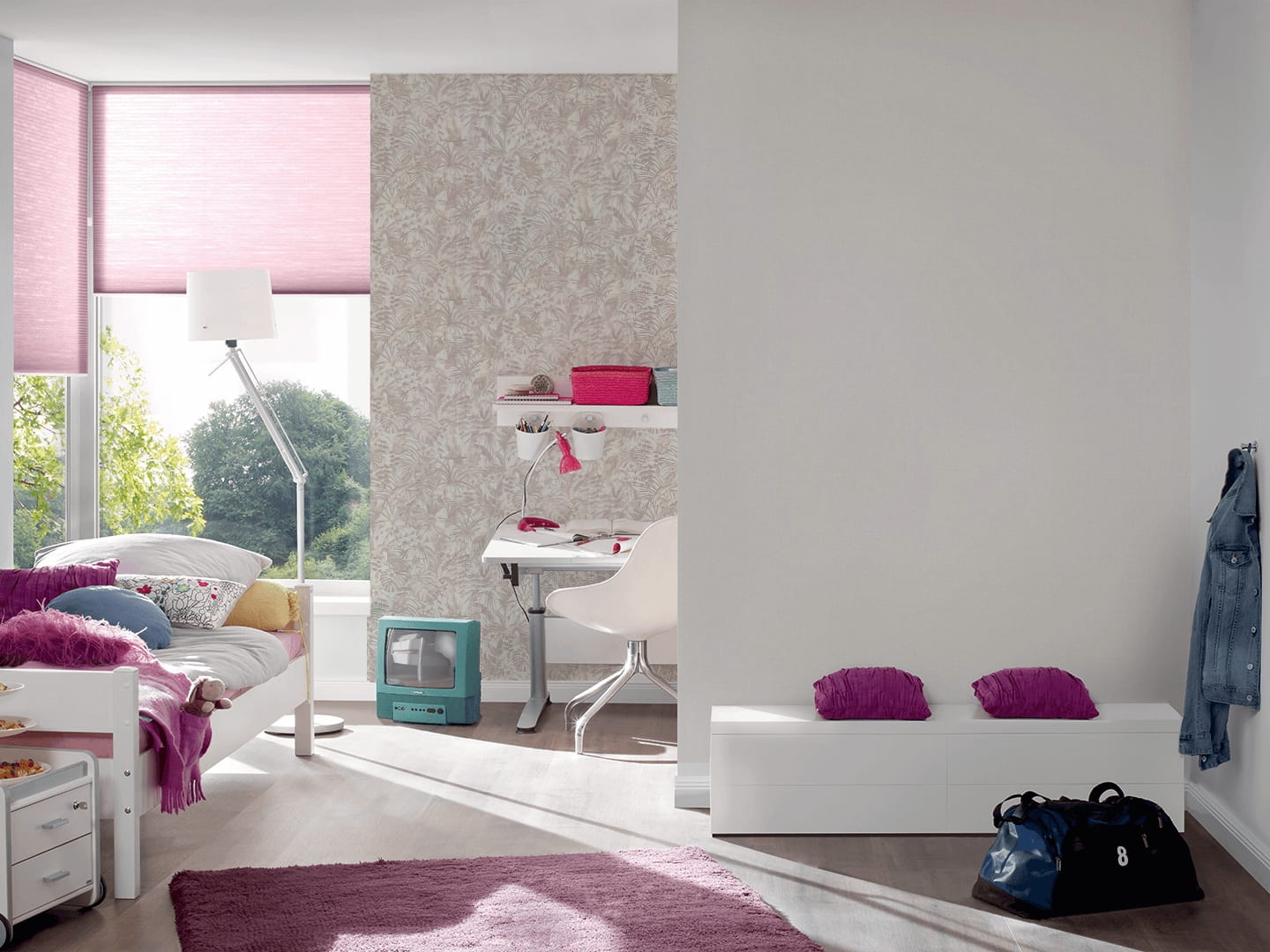 Ten wzór tapety możesz wykorzystać w dwojaki sposób. Może on zostać połączony z jednolitym tłem (zobacz w produktach powiązanych), dzięki czemu Twój pokój będzie wyglądał spójnie, a całość będzie sprawiała wrażenie przemyślanego i zaplanowanego projektu.