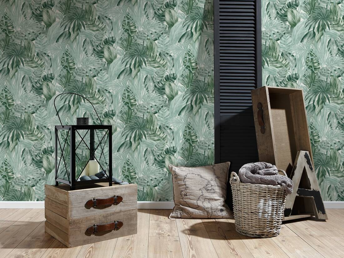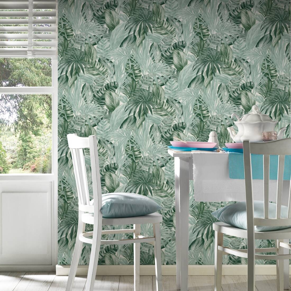 Różne tropikalne liście palm i paproci to wzór, który jest hitem nadchodzącego sezonu! Przenosi do naszego domu egzotyczne kraje południowe przypominającą bujną roślinność w zaroślach dżungli. Tapeta ma delikatnie tłoczoną strukturę. Na całkowicie gładkim tle, nałożone na siebie są różnego rodzaju, duże liście, których wzór jest podkreślony przez delikatne nałożenie warstw winylu.