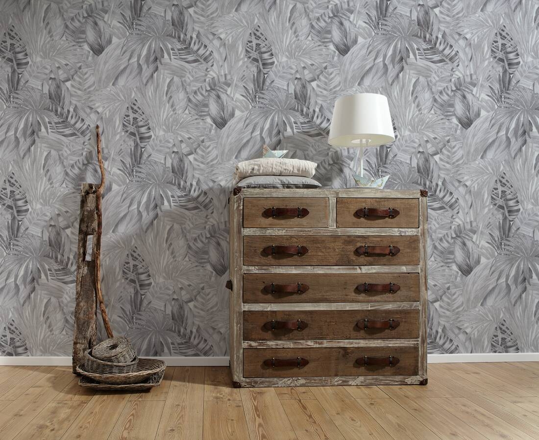 Tapeta w palmy, liście w kolorze szarym