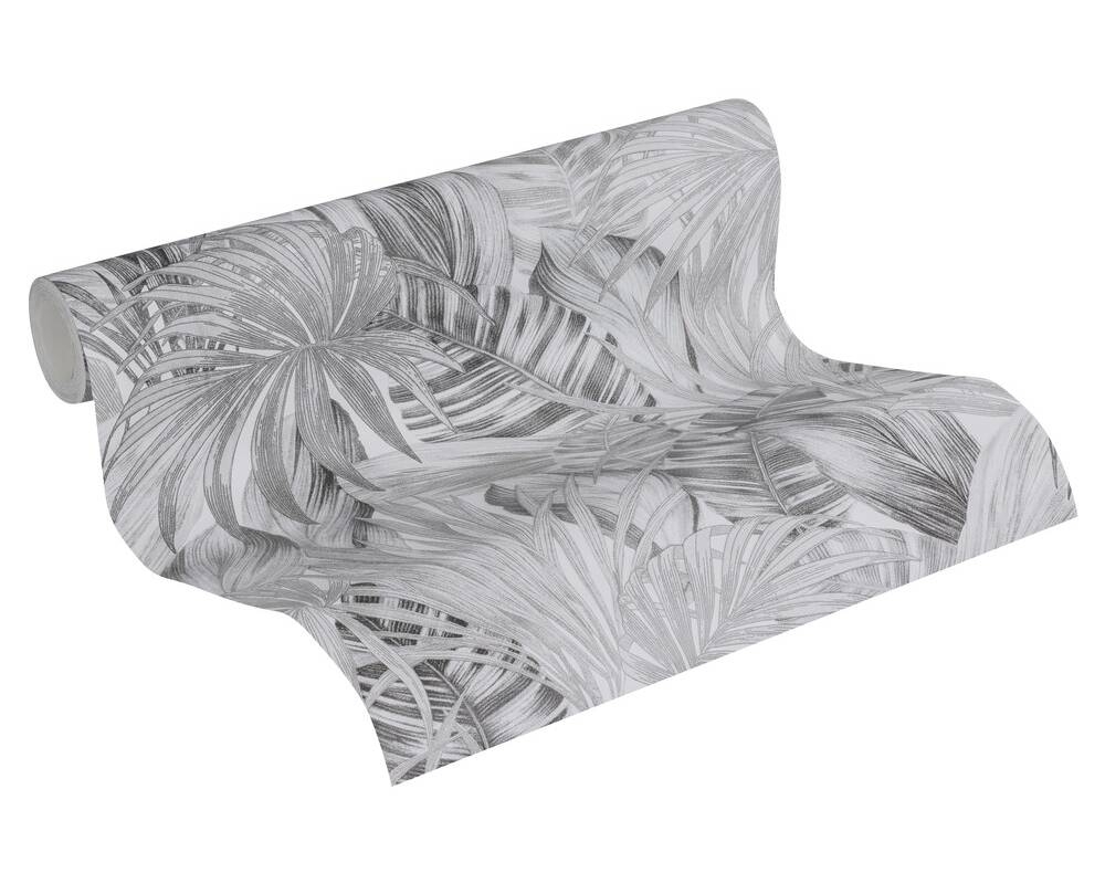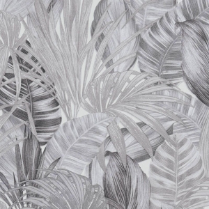 Różne tropikalne liście palm i paproci to wzór, który jest hitem nadchodzącego sezonu! Przenosi do naszego domu egzotyczne kraje południowe przypominającą bujną roślinność w zaroślach dżungli. Tapeta ma delikatnie tłoczoną strukturę. Na całkowicie gładkim tle, nałożone na siebie są różnego rodzaju, duże liście, których wzór jest podkreślony przez delikatne nałożenie warstw winylu.