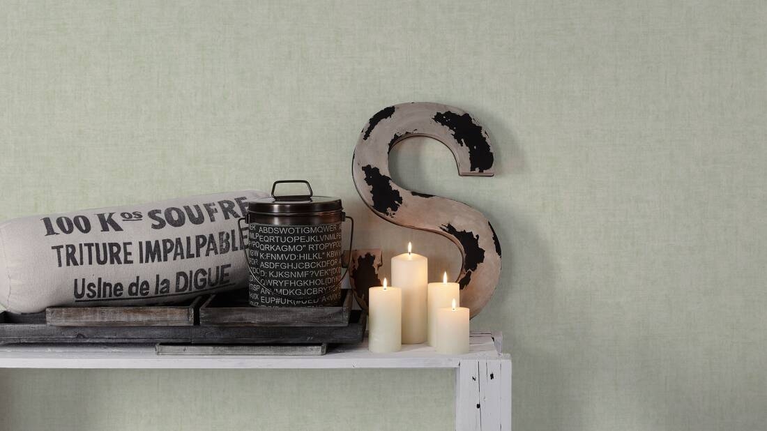 Ta jednobarwna, delikatnie tłoczona tapeta, o lnianej strukturze i matowym wyglądzie swój efekt osiągnęła dzięki nakrapianemu wzorowi w kolorze jasnej zieleni. Swoim kolorem podkreśla wzorzyste tapety dzikiej dżungli kolekcji "Greenery". Całość pociągnięta jakby jedną warstwą lakieru. Przenikające się kolory oraz drobna struktura tynku sprawia, że tapeta ukrywa drobne nierówności na ścianie.