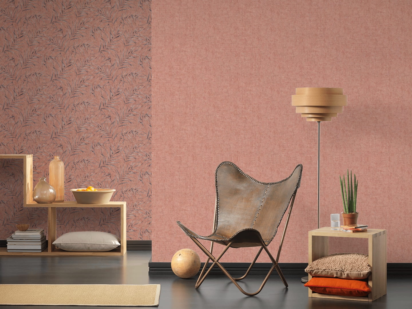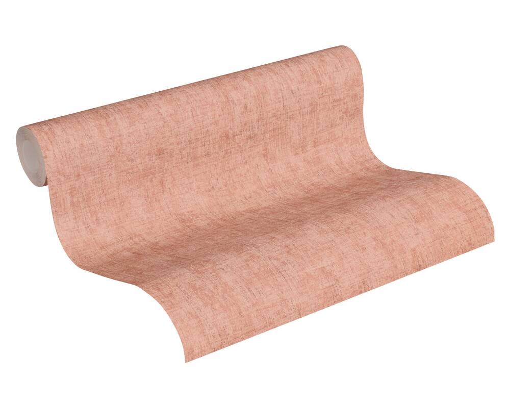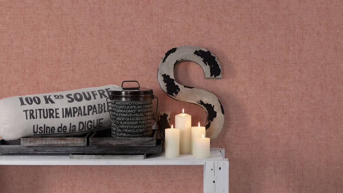 Ta jednobarwna, delikatnie tłoczona tapeta, o lnianej strukturze i matowym wyglądzie swój efekt osiągnęła dzięki nakrapianemu wzorowi w kolorze jasnoceglastej czerwieni z drobnymi szarymi przeszyciami. Swoim kolorem podkreśla wzorzyste tapety dzikiej dżungli kolekcji "Greenery". Całość pociągnięta jakby jedną warstwą lakieru. Przenikające się kolory oraz drobna struktura tynku sprawia, że tapeta ukrywa drobne nierówności na ścianie.