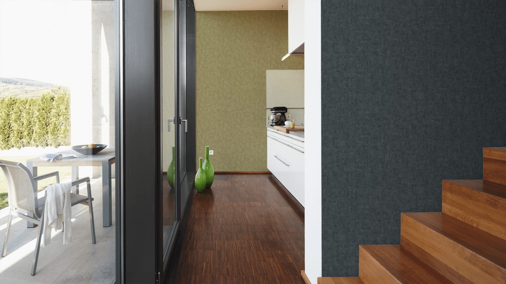 Ta jednobarwna, delikatnie tłoczona tapeta, o lnianej strukturze i matowym wyglądzie swój efekt osiągnęła dzięki nakrapianemu wzorowi w kolorze oliwkowym. Swoim kolorem podkreśla wzorzyste tapety dzikiej dżungli kolekcji "Greenery". Całość pociągnięta jakby jedną warstwą lakieru. Przenikające się kolory oraz drobna struktura tynku sprawia, że tapeta ukrywa drobne nierówności na ścianie.