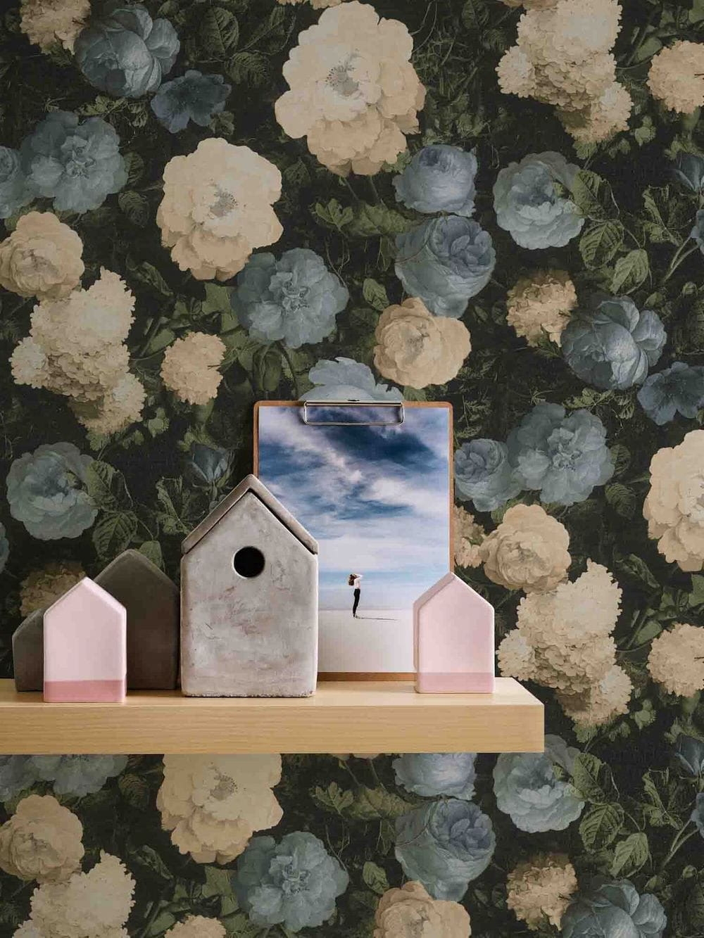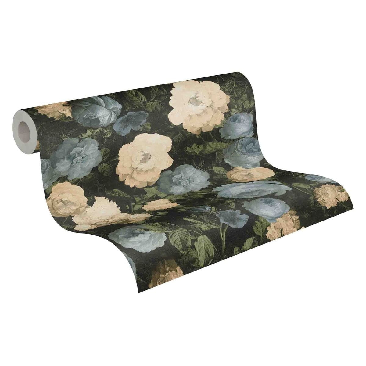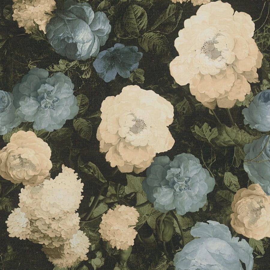Tapeta ścienna na flizelinie przedstawiająca obraz kwiatów namalowany na płótnie utrzymana w wyraźnej kolorystyce kremowo-niebieskiej na zielono-czarnym tle. Dzięki zastosowaniu nowoczesnego druku otrzymano trójwymiarowy obraz, który nadaje głębi tworzonej aranżacji ściennej. Wzór okładziny winylowej jest w stylu naturalnym i romantycznym i przedstawia jakiś wycinek natury, kępy kwiatów i liści namalowanych jakby na płótnie. Nowa odsłona kwietnego wzoru, ubogaciła świat tapet niemieckiego producenta AS Creation, na pewno ubogaci też nasze mieszkania, dając namiastkę obcowania z naturą.