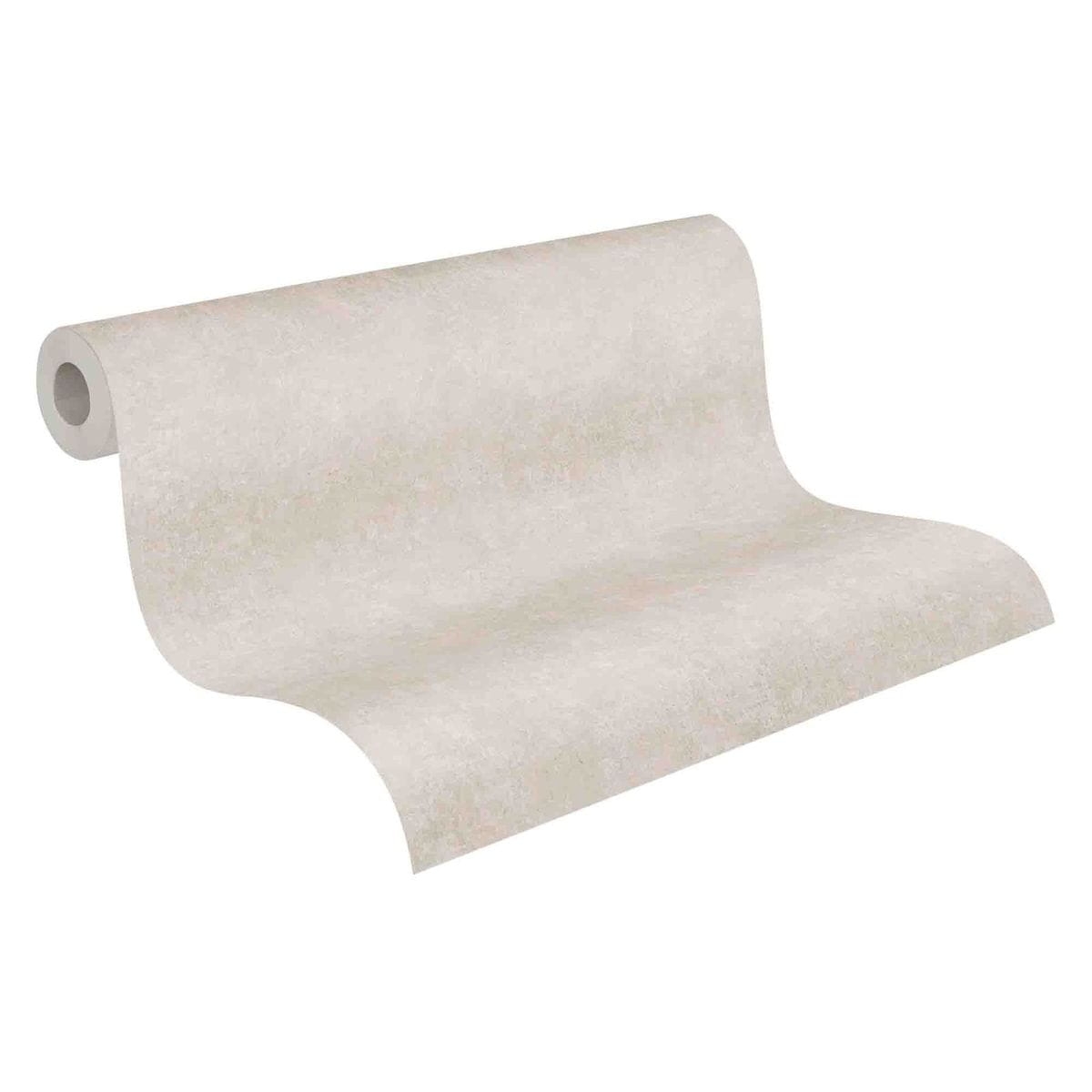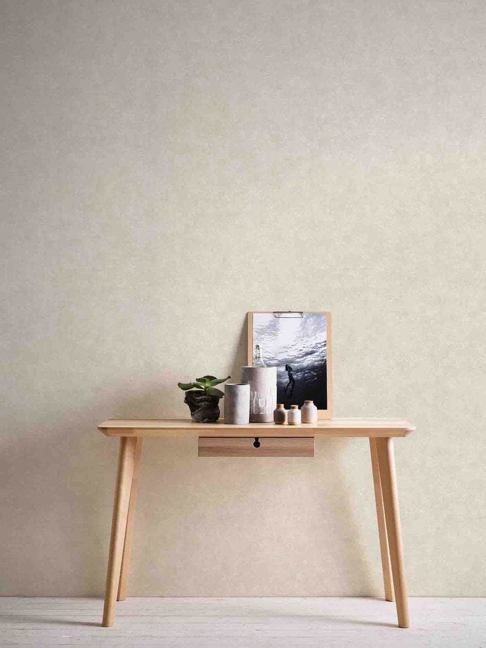 Powierzchnia tapety na flizelinie jest delikatnie tłoczona na wzór tynku weneckiego, nieregularnie przecierana w różnych odcieniach delikatnego beżowego koloru, z wklęsłymi, drobnymi elementami imitującymi zacierany tynk strukturalny. Bardzo mocny, odporny na zadrapania winyl na powierzchni flizelinowej okładziny ściennej jest delikatnie satynowy, co pozwala na ukrycie niedużych nierówności na ścianie.