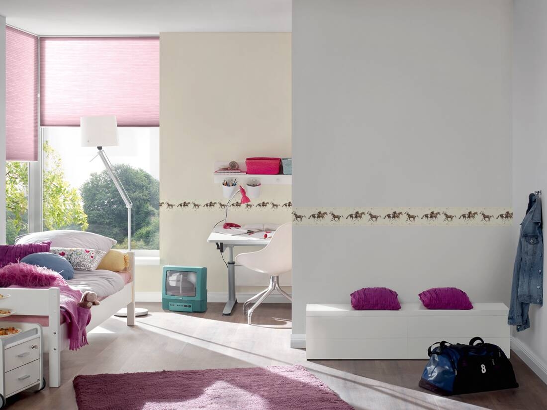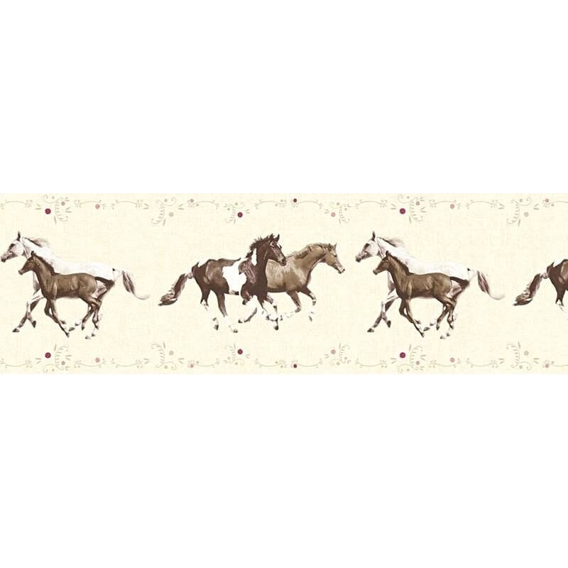 Ten wzór znajdzie uznanie wśród osób, które cenią sobie jasne kolory i ciekawe wzory w aranżacji dziecięcych wnętrz. Tło paska w odcieniu jasnego, delikatnego beżu, na nim wzór, który tworzą pary koni, okolone delikatnym, lekko połyskującym, roślinnym ornamentem z drobnymi kropkami w odcieniach różu. Brzegi paska również ozdobione, wykończone drobnymi, połyskującymi gałązkami i kropeczkami w różnych odcieniach różu. Aranżacja doskonale sprawdzi się jako ozdoba pokoju dziecięcego, tworząc ciekawe i niepowtarzalne wnętrze. Wzór ten może być wykorzystany jako wykończenie całego pomieszczenia, lub wybranego fragmentu ściany, w połączeniu ze spójnymi dodatkami stworzy ciekawą kompozycję dla naszego wnętrza.