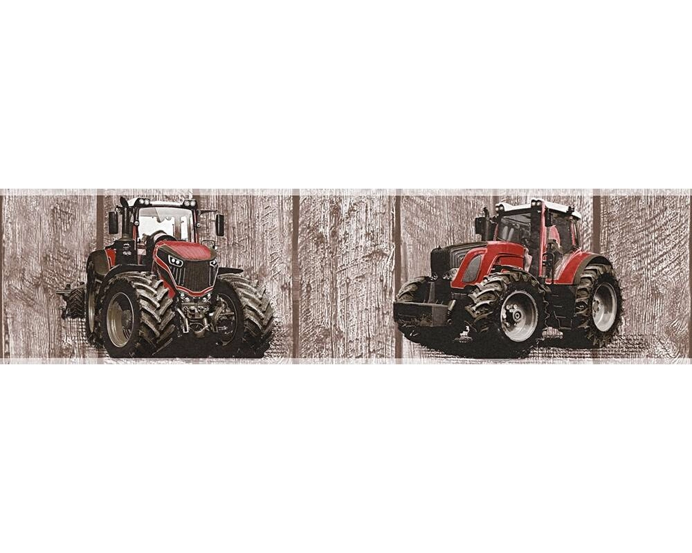 Pasek/bord z motywem traktorów na drewnianym tle, w odcieniach brązu, czerwieni, czerni