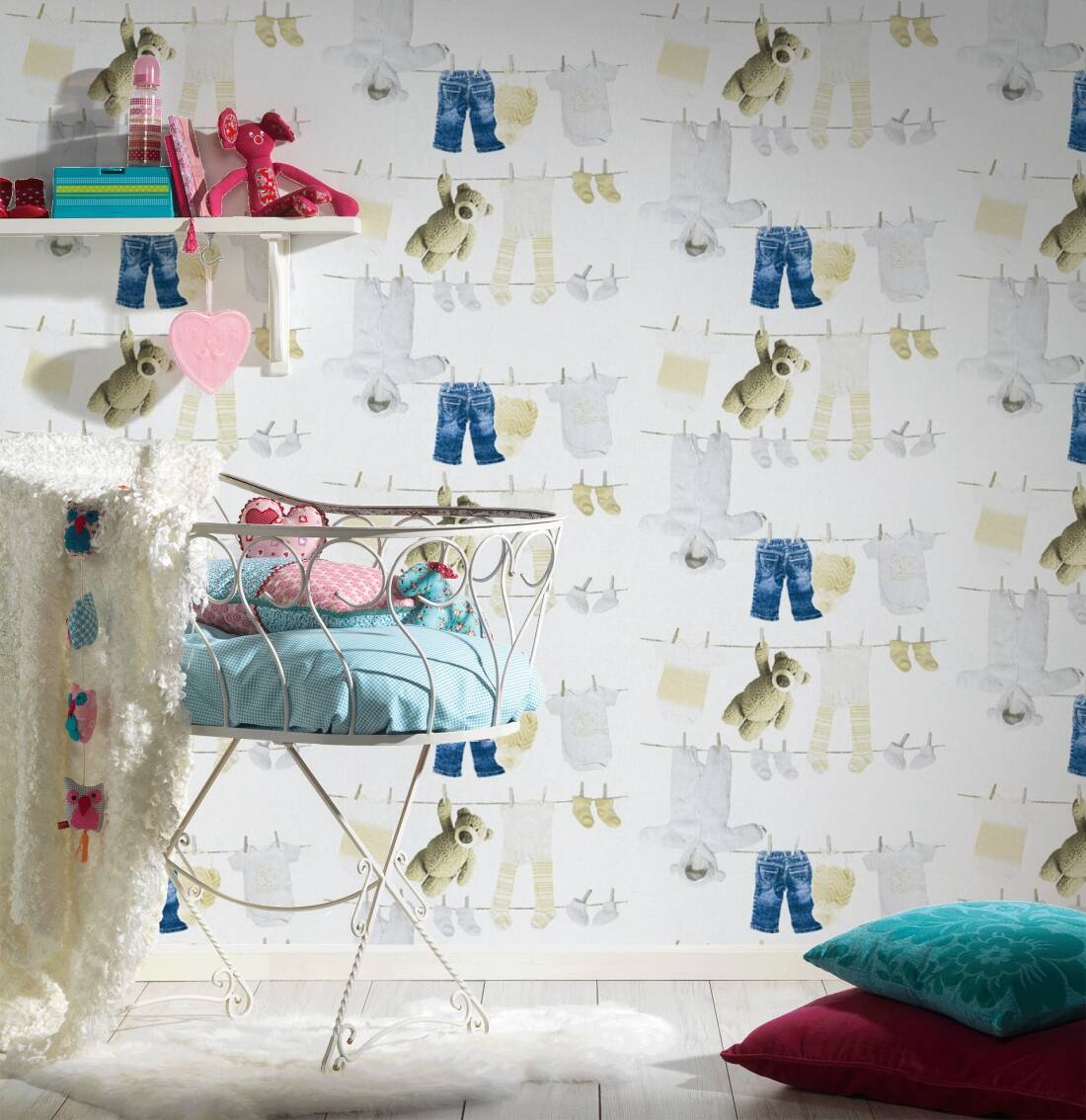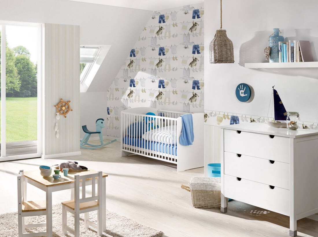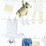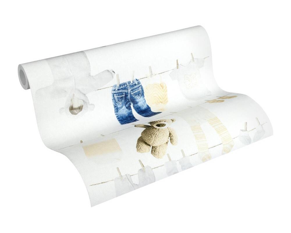 Ten wzór znajdzie uznanie wśród osób, które cenią sobie jasne i stonowane kolory i delikatne wzory w aranżacji dziecięcych wnętrz. Powierzchnia tapety o matowym wykończeniu, faktura lekko chropowata w dotyku, formuje się w strukturę przypominającą delikatny splot tkaninowy. Matowe tło tapety w odcieniu bieli, ozdobione jest bardzo realnie przedstawionymi dziecięcymi ubrankami wiszącymi na sznurku na pranie, przypięte klamerkami, w towarzystwie pluszowego misia. Motywy w odcieniach niebieskiego, beżu, bieli i brązu. Aranżacja doskonale sprawdzi się jako ozdoba pokoju dziecięcego, tworząc przytulne i niepowtarzalne wnętrze. Wzór ten może być wykorzystany jako wykończenie całego pomieszczenia, lub wybranego fragmentu ściany, w połączeniu ze spójnymi dodatkami i jednobarwnymi tłami stworzy ciekawą kompozycję dla naszego wnętrza.