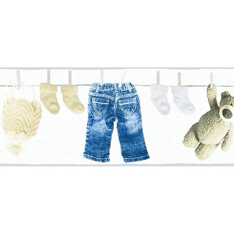 Tapeta/Pasek z motywem dziecięcych ubranek i pluszowego misia, prezentuje się dobrze i stworzy piękny wystrój w pokoju dziecięcym. W połączeniu z pasującymi tapetami z kolekcji i odpowiednimi dodatkami doskonale ozdobi i stworzy niepowtarzalny klimat w przestrzeni naszych najmłodszych.