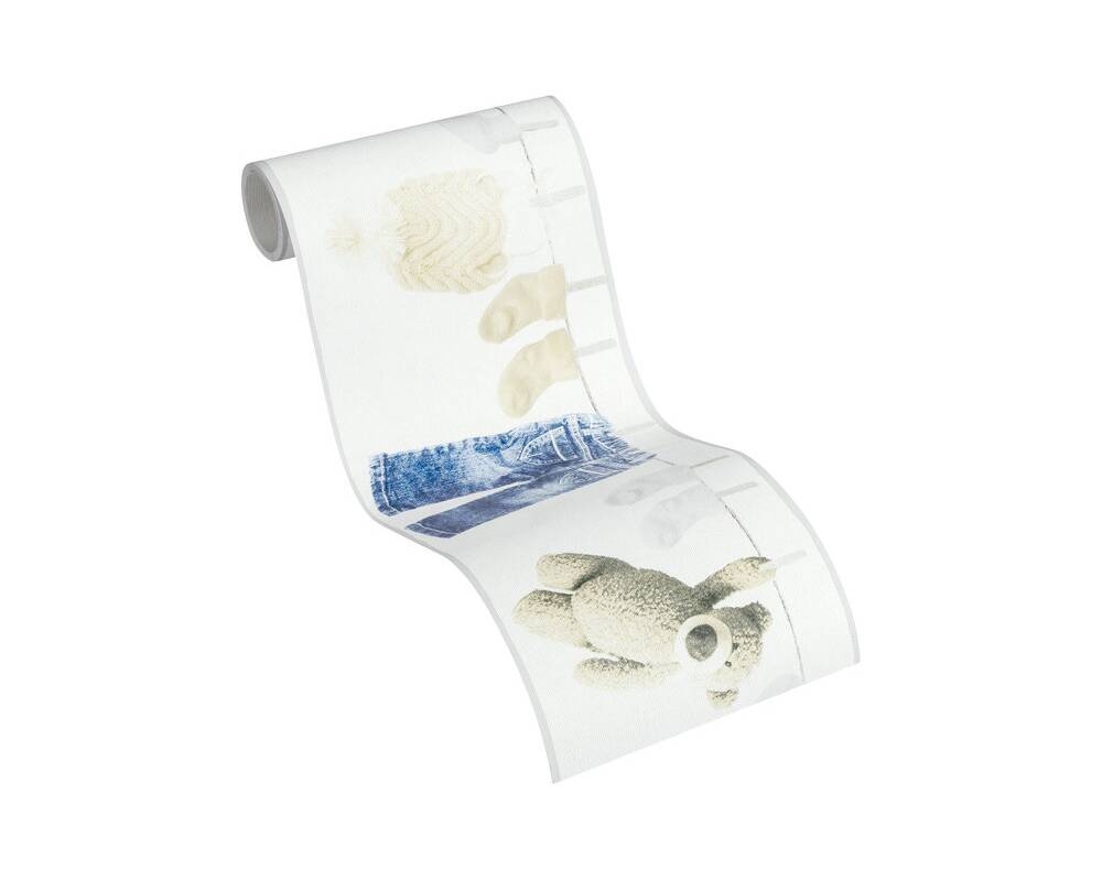 Ten wzór znajdzie uznanie wśród osób, które cenią sobie jasne i stonowane kolory i delikatne wzory w aranżacji dziecięcych wnętrz. Powierzchnia tapety o matowym wykończeniu, faktura lekko chropowata w dotyku, formuje się w strukturę przypominającą delikatny splot tkaninowy. Matowe tło tapety w odcieniu bieli, ozdobione jest bardzo realnie przedstawionymi dziecięcymi ubrankami wiszącymi na sznurku na pranie, przypięte klamerkami, w towarzystwie pluszowego misia. Motywy w odcieniach niebieskiego, beżu, bieli i brązu. Aranżacja doskonale sprawdzi się jako ozdoba pokoju dziecięcego, tworząc przytulne i niepowtarzalne wnętrze. Wzór ten może być wykorzystany jako wykończenie całego pomieszczenia, lub wybranego fragmentu ściany, w połączeniu ze spójnymi dodatkami i jednobarwnymi tłami stworzy ciekawą kompozycję dla naszego wnętrza.