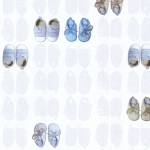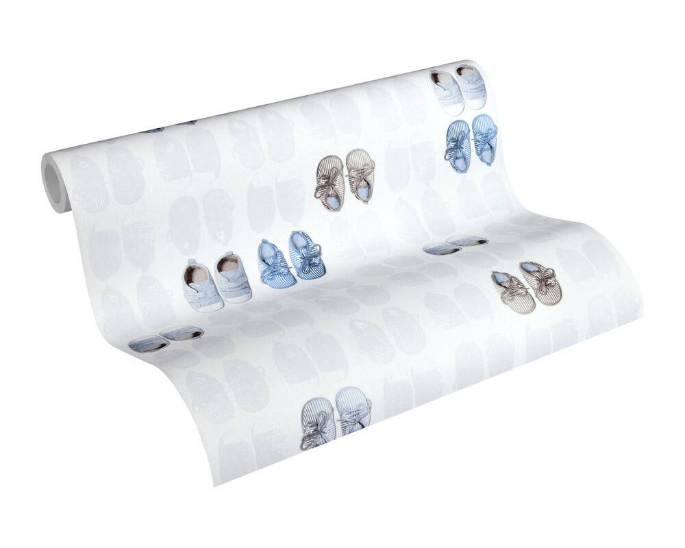 Ten wzór znajdzie uznanie wśród osób, które cenią sobie jasne i stonowane kolory i delikatne wzory w aranżacji dziecięcych wnętrz. Powierzchnia tapety o matowym wykończeniu, faktura lekko chropowata w dotyku, formuje się w strukturę przypominającą delikatny splot tkaninowy. Matowe tło tapety w odcieniu bieli, gęsto wypełniają symetrycznie ułożone pary dziecięcych bucików w pastelowej kolorystyce. Większość w formie delikatnych cieni w odcieniu delikatnej szarości, gdzieniegdzie tylko wyraźne kolorowe buciki w odcieniach niebieskiego i szarości, które stworzą idealny wystrój w pokoju małego chłopczyka. Aranżacja doskonale sprawdzi się jako ozdoba pokoju dziecięcego, tworząc przytulne i niepowtarzalne wnętrze. Wzór ten może być wykorzystany jako wykończenie całego pomieszczenia, lub wybranego fragmentu ściany, w połączeniu ze spójnymi dodatkami stworzy ciekawą kompozycję dla naszego wnętrza.