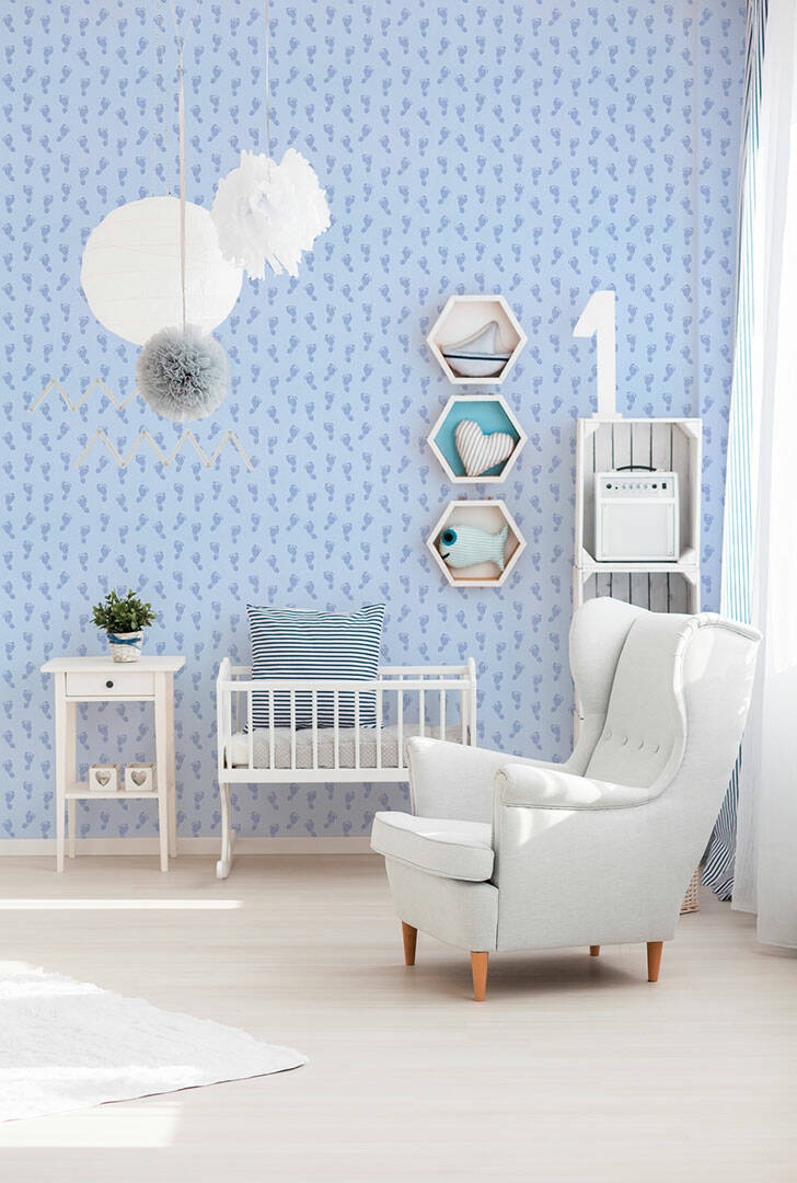 Ten wzór znajdzie uznanie wśród osób, które cenią sobie jasne i stonowane kolory i delikatne wzory w aranżacji dziecięcych wnętrz. Powierzchnia tapety o matowym wykończeniu, faktura lekko chropowata w dotyku, formuje się w strukturę przypominającą delikatny splot tkaninowy. Matowe tło tapety w odcieniu jasnego błękitu, gęsto wypełniają symetrycznie ułożone odciski dziecięcych stópek połyskujące metalicznym blaskiem w tym samym odcieniu co tło. Aranżacja doskonale sprawdzi się jako ozdoba pokoju dziecięcego, tworząc przytulne i niepowtarzalne wnętrze. Wzór ten może być wykorzystany jako wykończenie całego pomieszczenia, lub wybranego fragmentu ściany, w połączeniu ze spójnymi dodatkami stworzy ciekawą kompozycję dla naszego wnętrza.
