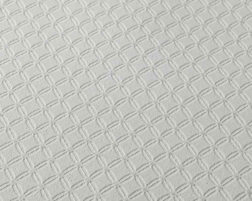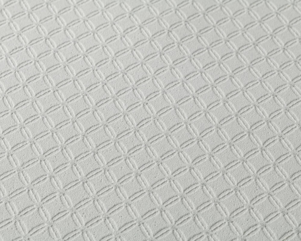 Tapeta o ciekawej kolorystyce i interesującej teksturze, znajdzie uznanie u wszystkich, którzy lubią i cenią sobie nowoczesne a zarazem proste rozwiązania w aranżacji swoich wnętrz. Faktura tapety jednolita, minimalnie chropowata, aksamitna w dotyku. Kompozycja w odcieniach szarości, składa się z siatki niewielkich, drobnych rombów/rezetek, które na łączeniach wykończone są srebrnym, błyszczącym elementem-punktem. Wzór jest wyraźnie tłoczony-wklęsły względem tła, kompozycja jest bardzo gęsta, jednak delikatna, doskonale sprawdzi się również w roli tła, zaś delikatne srebrne ozdobniki sprawiają, że wzór ma w sobie elegancką nutę.
