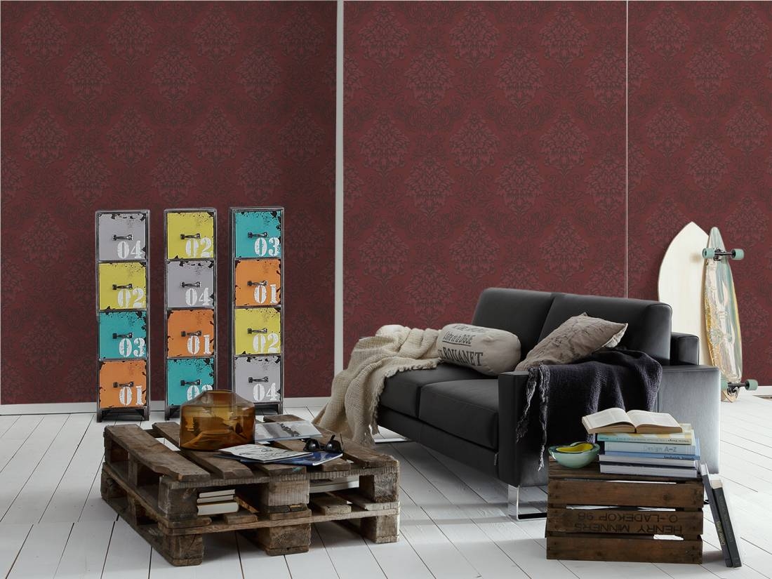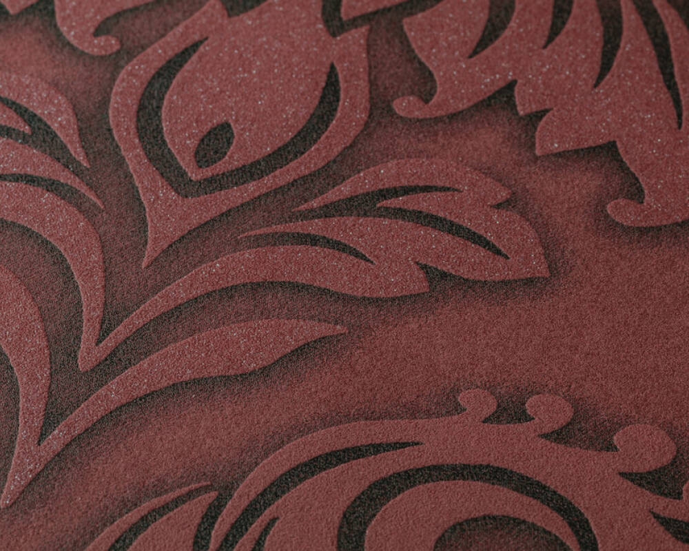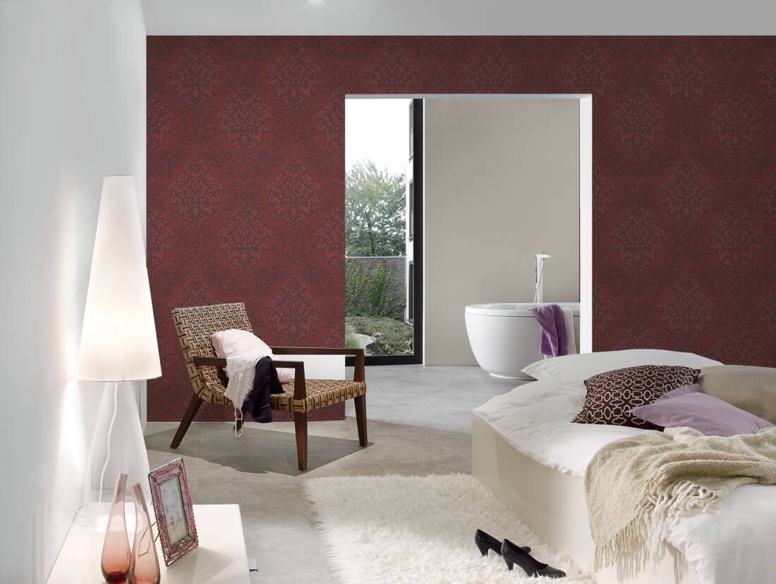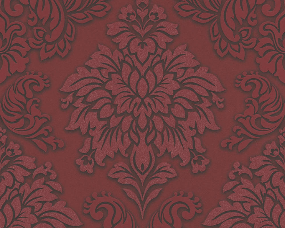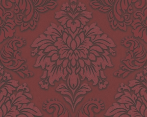 Tapeta o bogatym, ornamentowym wzorze i interesującej teksturze, znajdzie uznanie u wszystkich, którzy lubią i cenią sobie stylowe i eleganckie rozwiązania w aranżacji swoich wnętrz. Faktura tapety gładka, jakby aksamitna w dotyku. Tło w odcieniu eleganckiej i dostojnej bordowej czerwieni, na nim bogaty, rozłożysty i nie mniej elegancki i dostojny wzór ornamentowy w kolorze tła o delikatnie przyciemnianych zewnętrznych konturach - dzięki czemu wygląda przestrzennie. Środkowa rozeta delikatnie oprószona brokatem . Kompozycja stylowa i okazała, doskonale ozdobi wnętrza o barokowym charakterze i nie tylko, wystarczy odrobina wyobraźni...