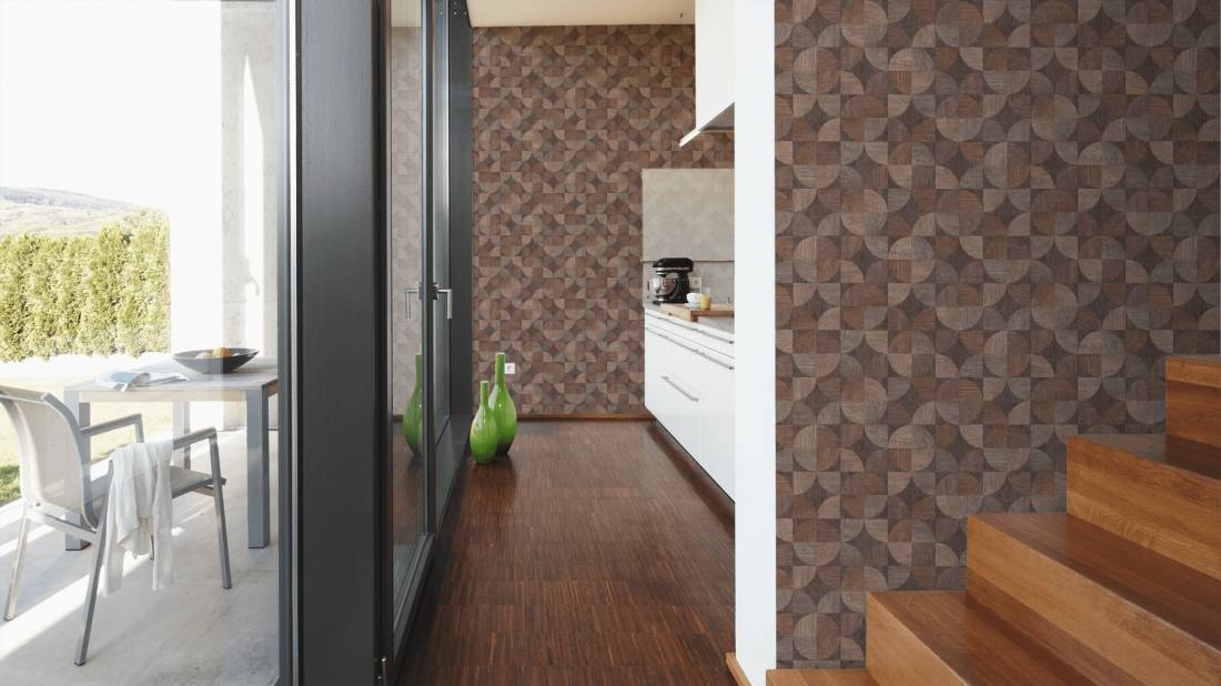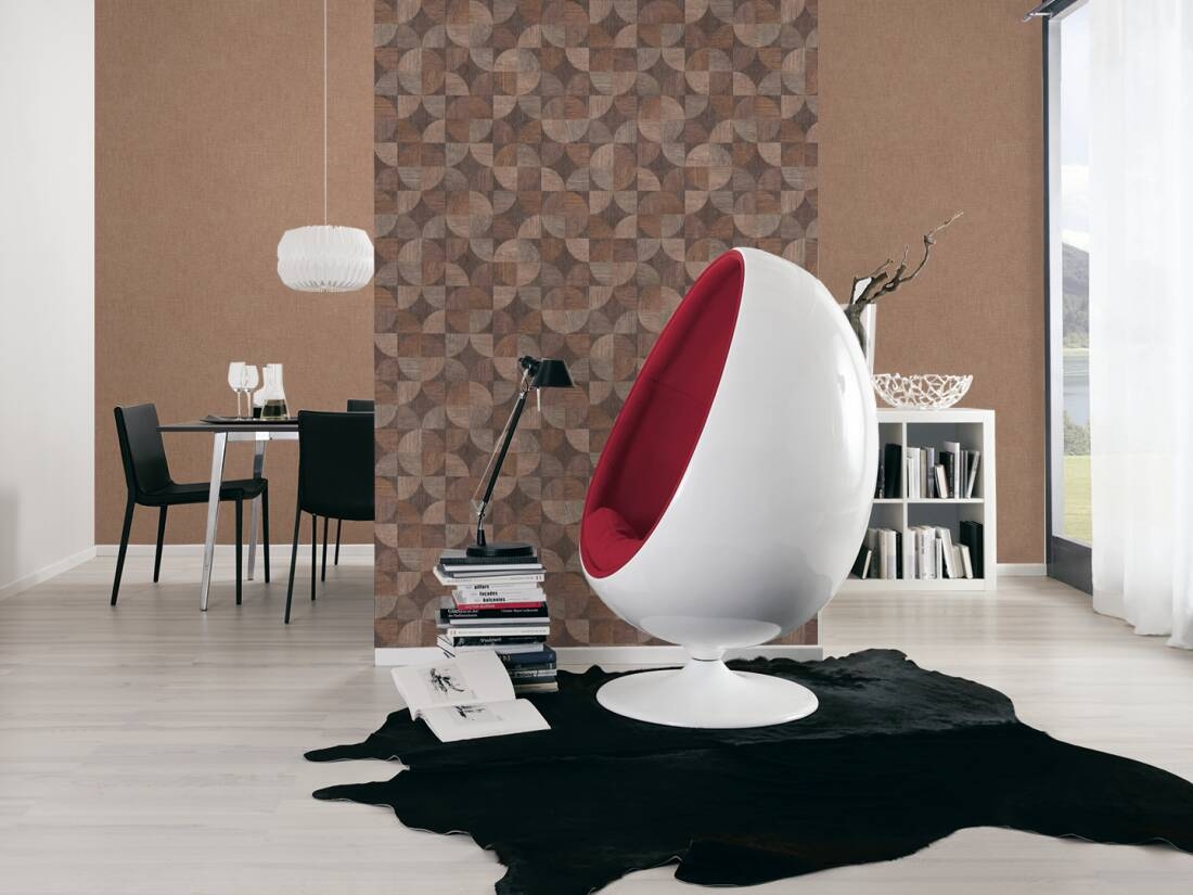 Tapeta o ciekawym wzorze i interesującej teksturze, znajdzie uznanie u wszystkich, którzy lubią i cenią sobie proste, uniwersalne i nowoczesne rozwiązania w aranżacji swoich wnętrz. Struktura tapety lekko tłoczona, wyczuwalne są nieregularne pionowe prążki. Powierzchnia tapety podzielona jest na kwadraty, w których naprzemiennie cztery różne ćwiartki tworzą koło, lub umiejscowione są w jego rogach. Tło tapety oraz wszystkie figury i elementy geometryczne mają fakturę do złudzenia przypominającą fakturę drewna. Kolorystyka również jak najbardziej naturalna- widocznych jest wiele odcieni beżu i brązu. Naturalna, pełna ciepła i eleganckiej prostoty kompozycja, która nada szczególnego charakteru naszym wnętrzom.