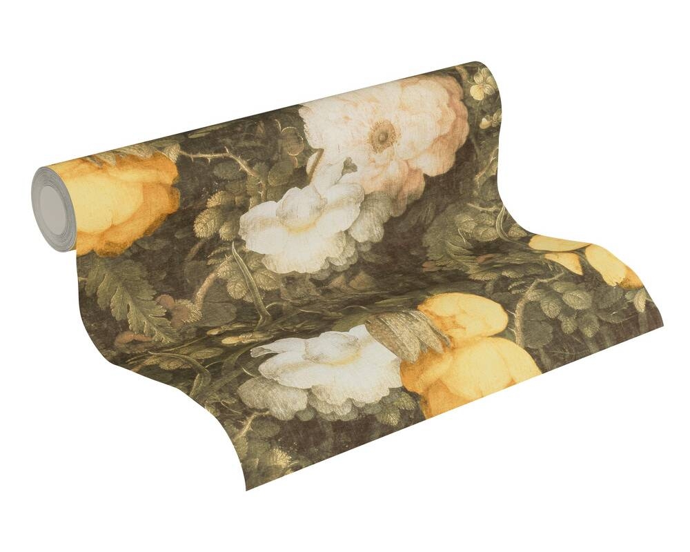 Ciemne, o głębokim kolorze tło w odcieniach zieleni i czerni, zdobią jasne beżowo-kremowe i intensywnie żółte kwiaty. Duże pąki kwiatów okolone gęstwiną liści i gałązek, w nieco stylowym charakterze- przypomina to do złudzenia malowany na płótnie obraz. Ciekawa aranżacja ścienna, ubogaci nasze stylowe, eleganckie wnętrza, lecz nie tylko...
