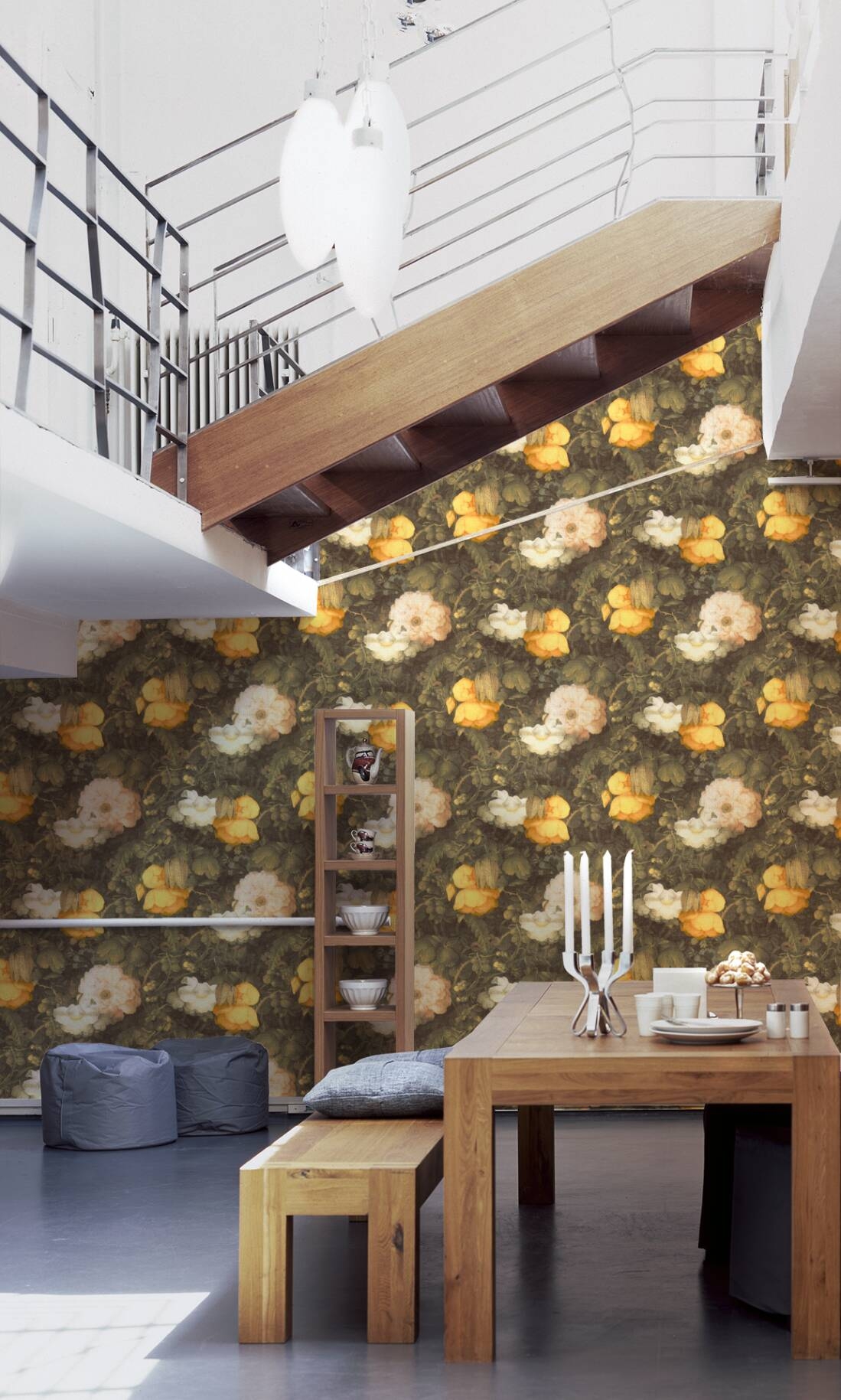 Tapeta w kwiaty w odcieniach zieleni, żółtego, beżu