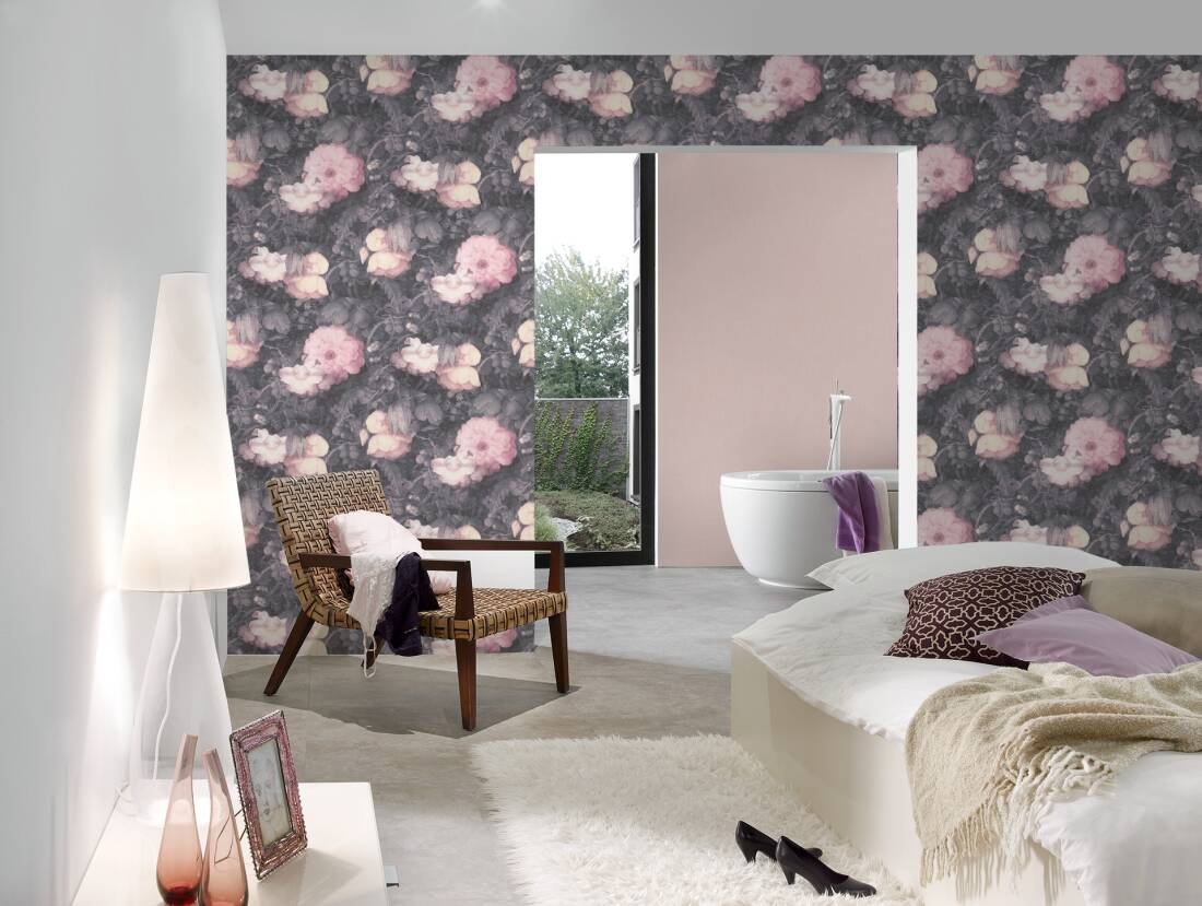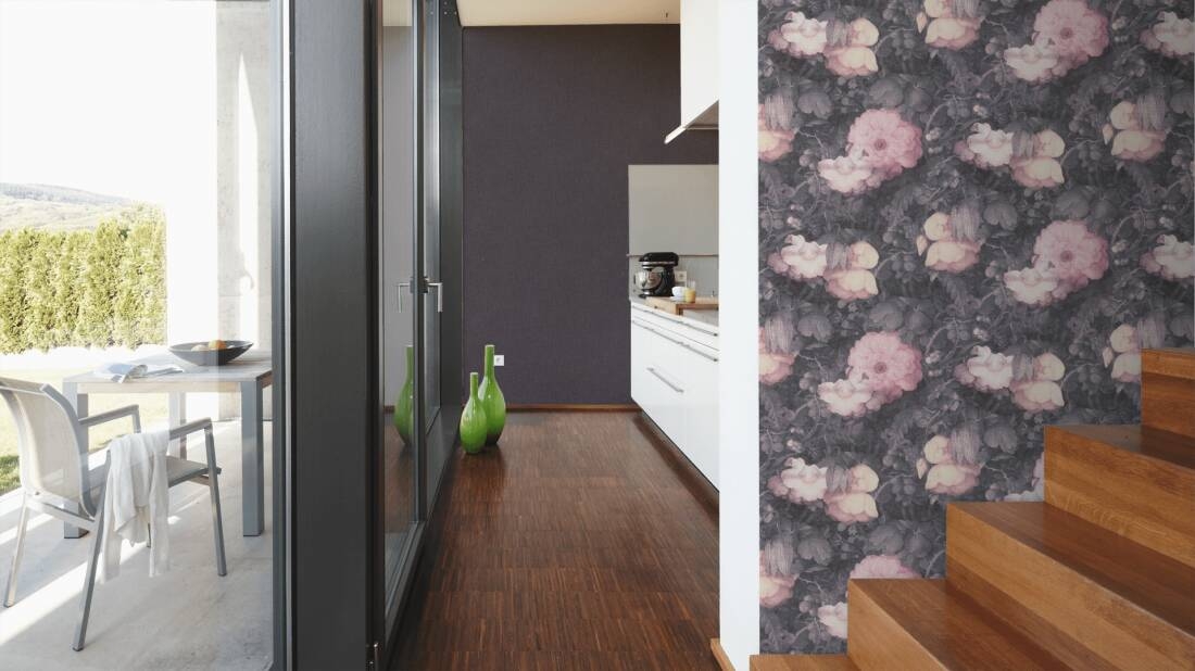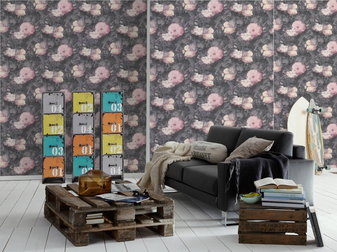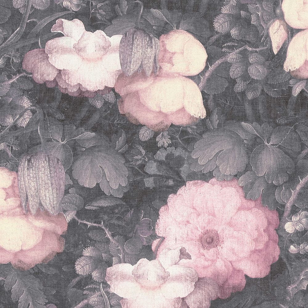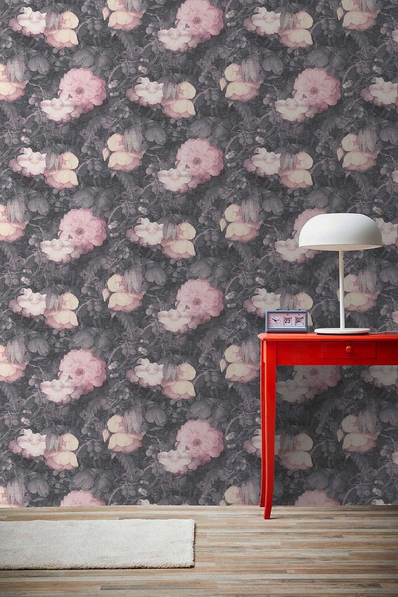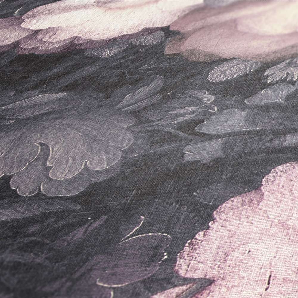 Ciemne, o głębokim kolorze tło w odcieniach szarości i czerni, zdobią blado-różowe i fioletowe, miejscami rozbielone kwiaty. Duże pąki kwiatów okolone gęstwiną liści i gałązek, w nieco stylowym charakterze- przypomina to do złudzenia malowany na płótnie obraz. Ciekawa aranżacja ścienna, ubogaci nasze stylowe, eleganckie wnętrza, lecz nie tylko...