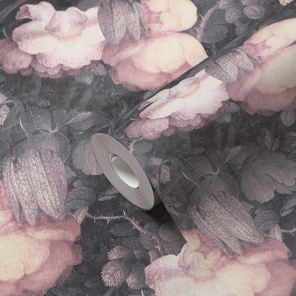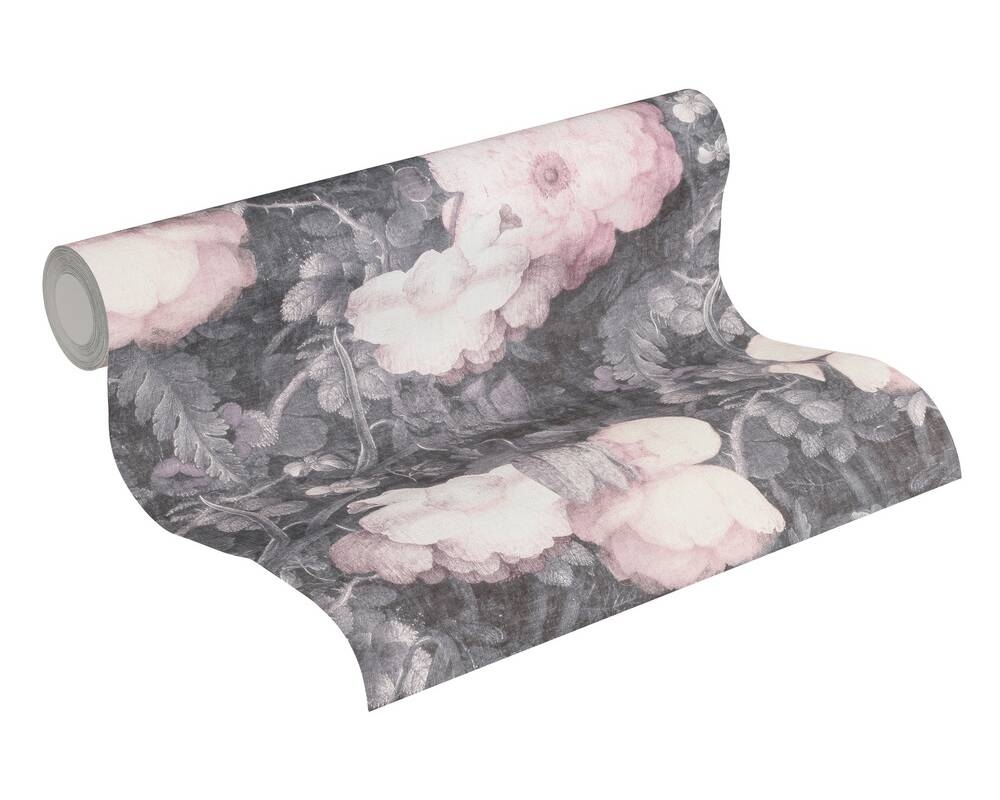 Tapeta w kwiaty w odcieniach szarości, różu, fioletu