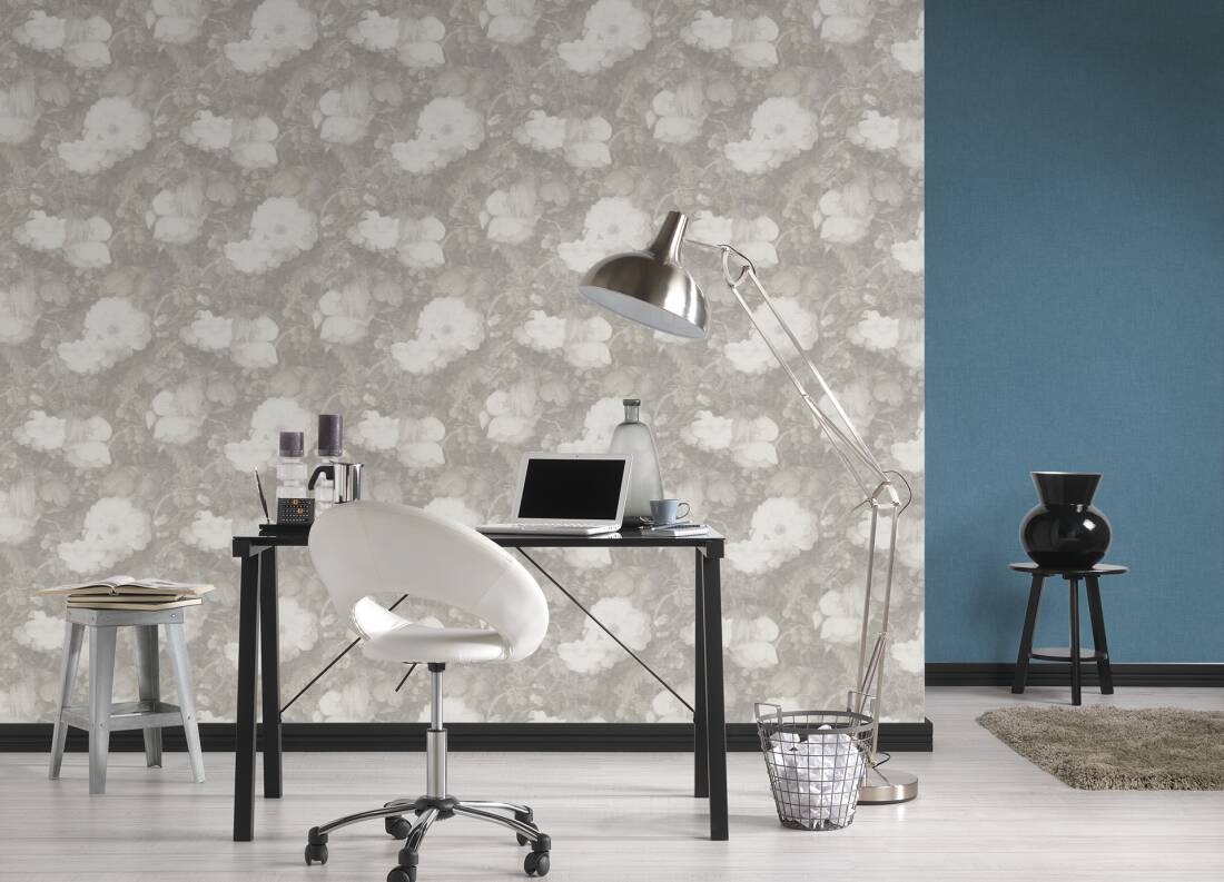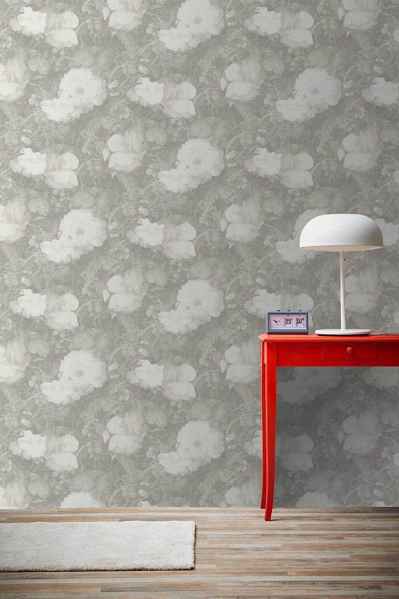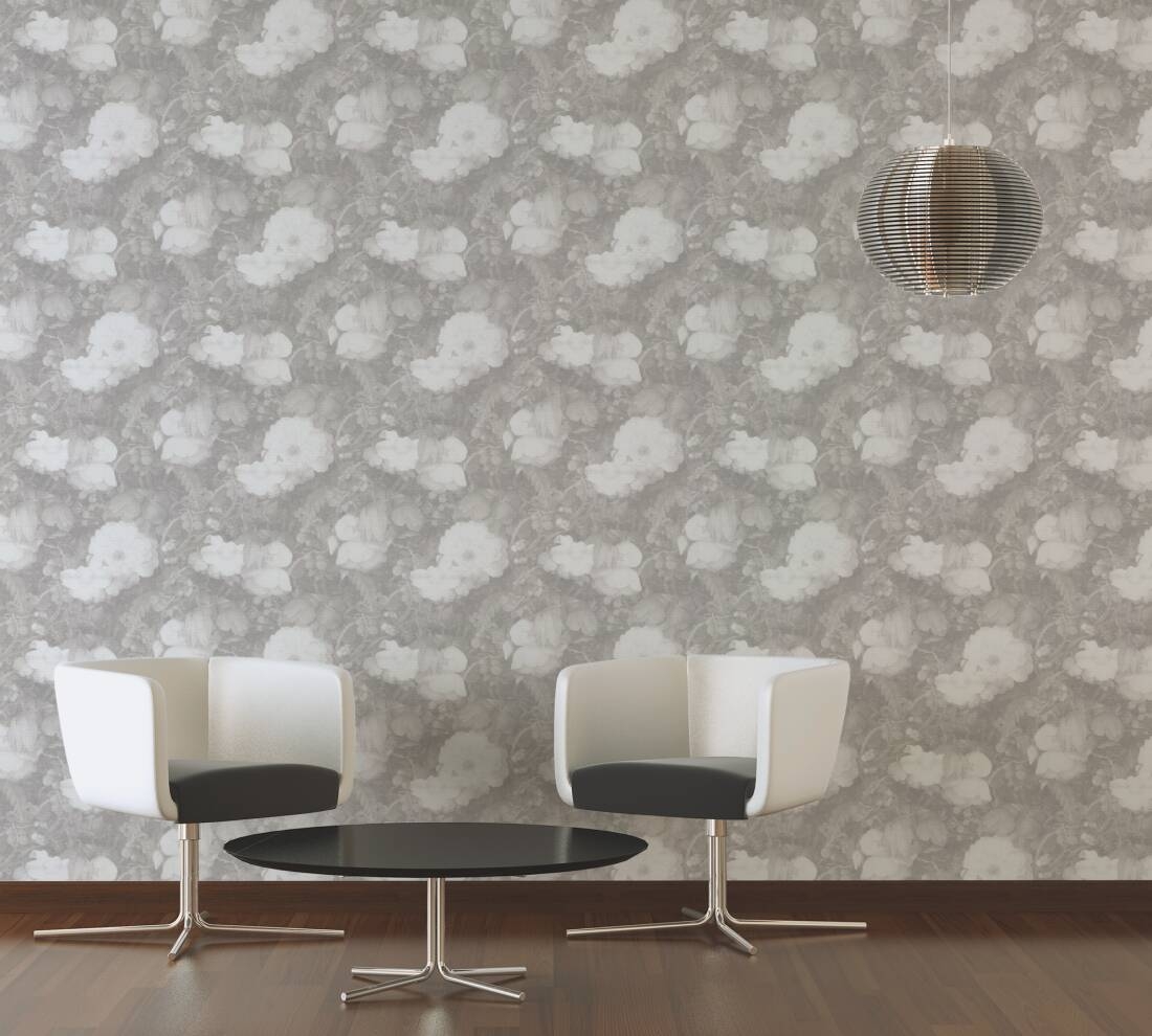Tapetę wypełnia gęsty kwiatowy motyw utrzymany w tonacji szaro- białej. Duże pąki kwiatów okolone gęstwiną liści i gałązek, w nieco stylowym charakterze, przypomina malowany na płótnie obraz. Ciekawa aranżacja ścienna, ubogaci nasze stylowe, eleganckie wnętrza, lecz nie tylko...